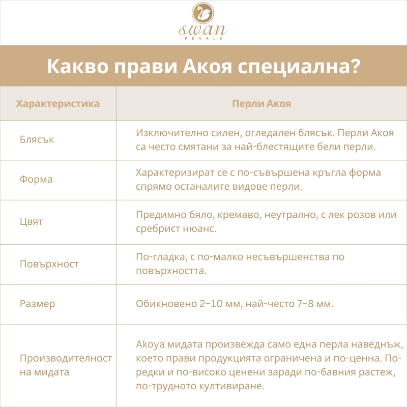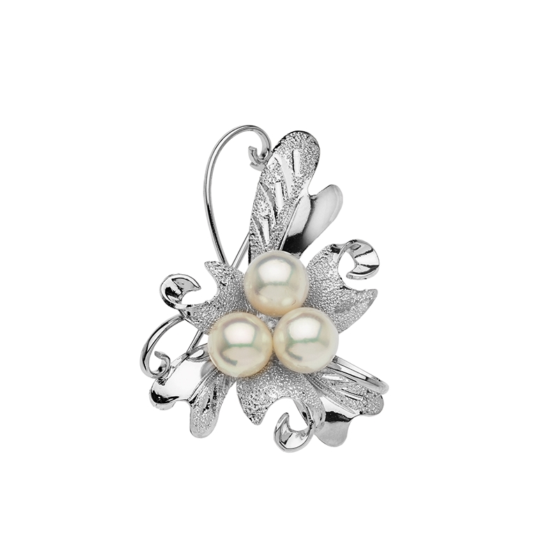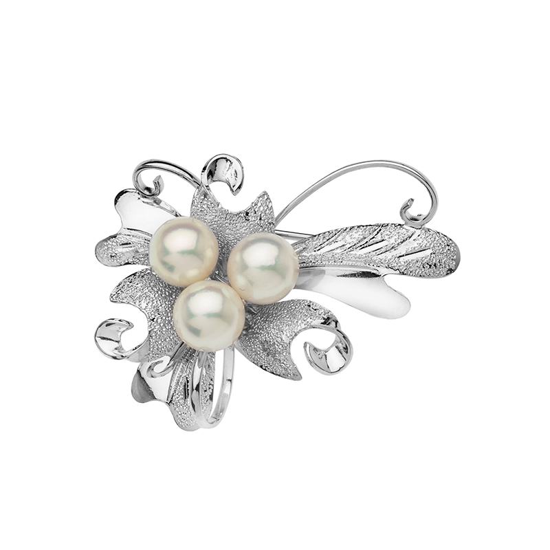 Тази брошка е изработена от сребро проба 925 с родиево покритие. Основният акцент в бижуто е композицията от три естествени морски перли Акоя. Известни като едни от най-престижните перли в света, те се отличават с почти перфектна сферична форма и изключително дълбок, огледален блясък. Повърхността им притежава характерен копринен сияен ефект с розови и кремави нюанси. Родиевата обработка на среброто осигурява надеждна защита от потъмняванe. Брошката е изработена със сигурно закопчаване, което позволява лесното ѝ поставяне върху ревери, шалове или официални облекла. Изтънчените детайли и сиянието на морските перли правят това бижу подходящо за дами, които ценят дискретния лукс.