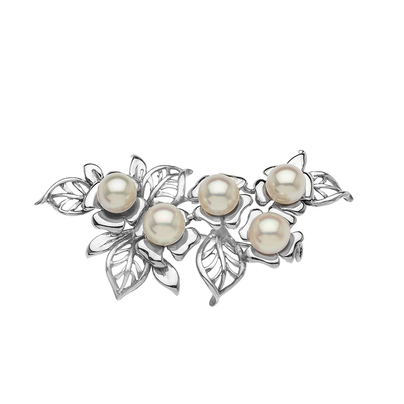 Тази брошка е изработена от сребро проба 925 с родиево покритие. Известни като едни от най-престижните перли в света, те се отличават с почти перфектна сферична форма и изключително дълбок, огледален блясък. Естественият им блясък притежава копринена мекота с деликатни розови и кремави нюанси.