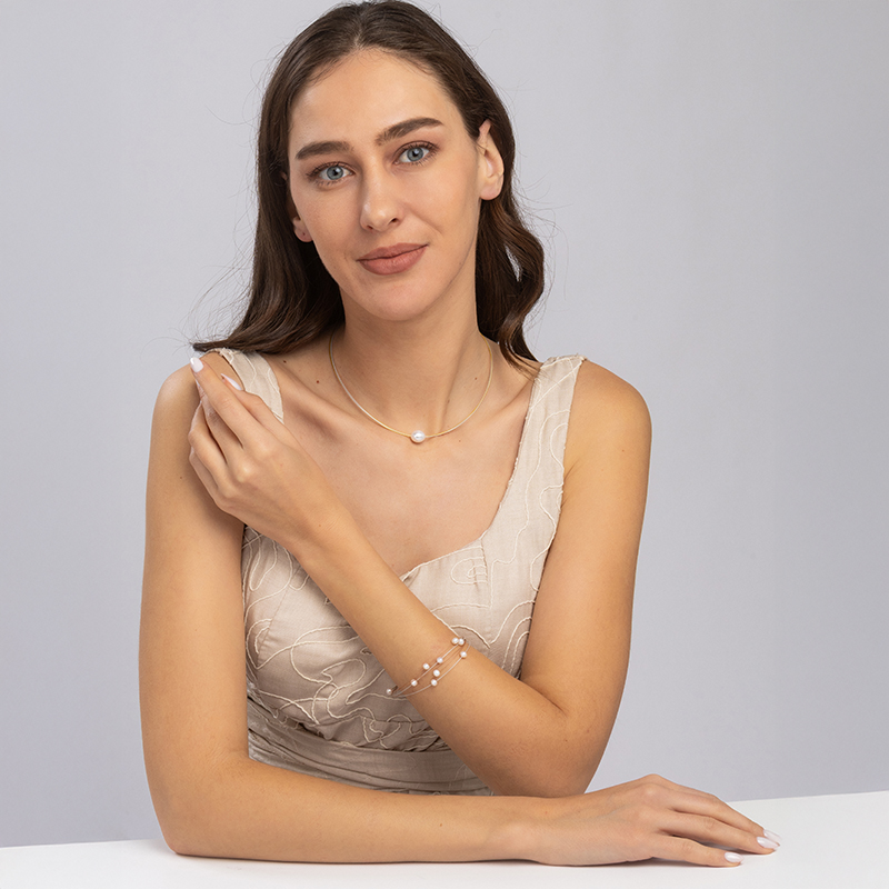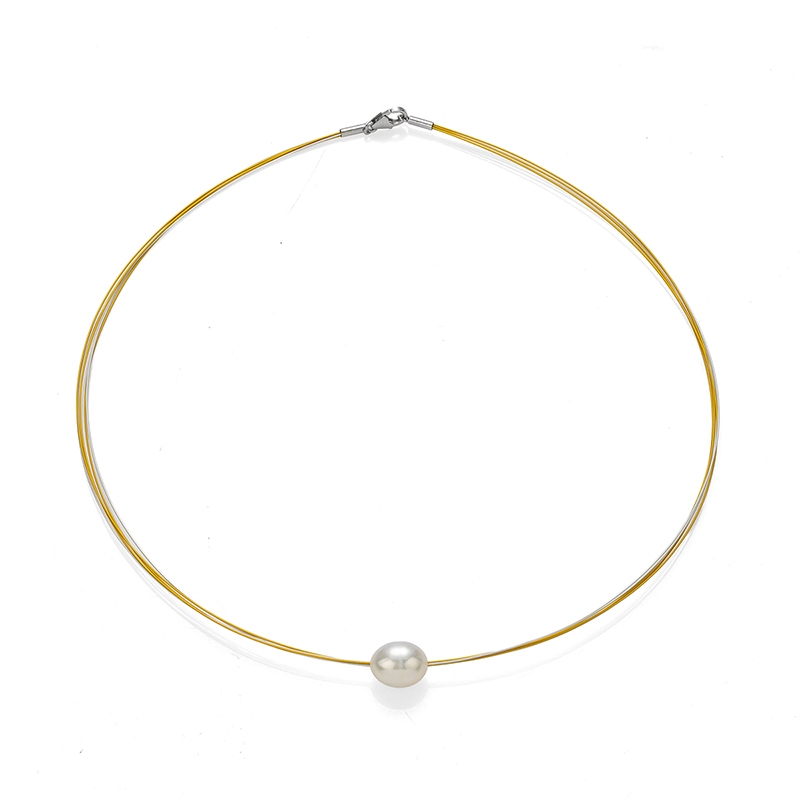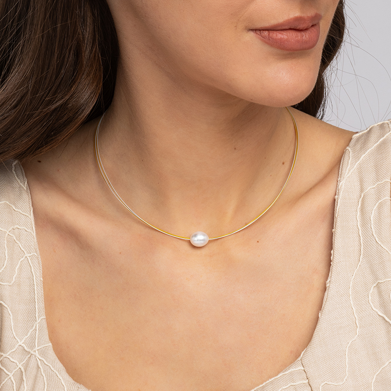 Нежно колие с бяла сладководна барокова перла, фиксирана върху фина жълта корда.