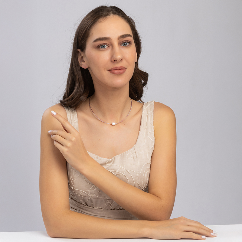 Нежно колие с бяла сладководна барокова перла, фиксирана върху фина розова корда.