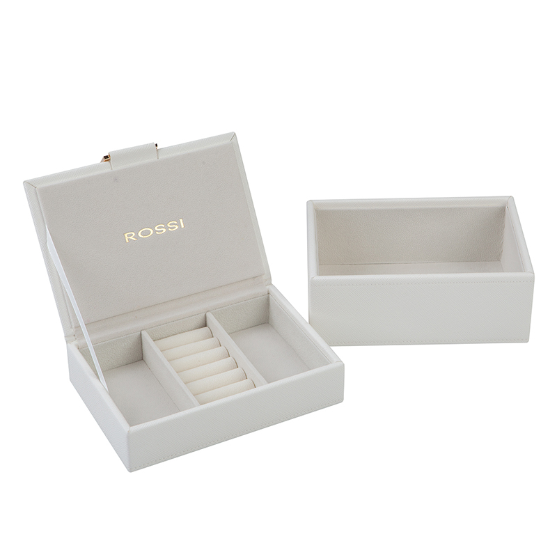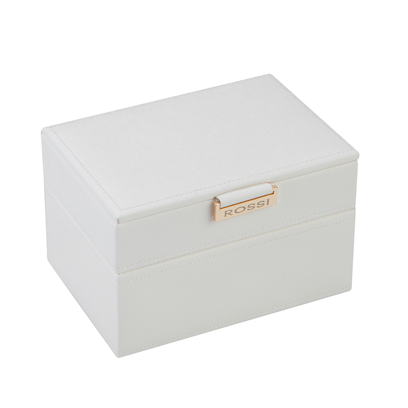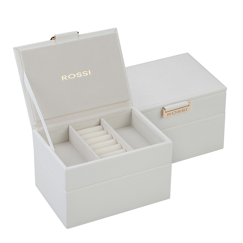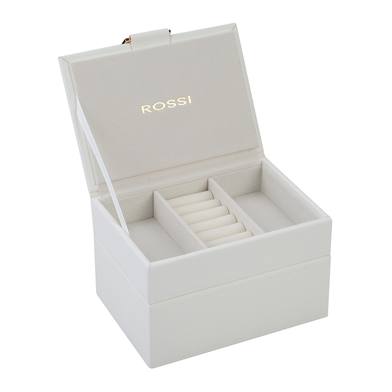 Добави нежност и елегантност към своята колекция с тази стилна кутия за бижута Rossi в елегантен бял цвят. Съчетавайки модерен дизайн и практичност, тя е създадена да организира бижутата ти по удобен и красив начин.