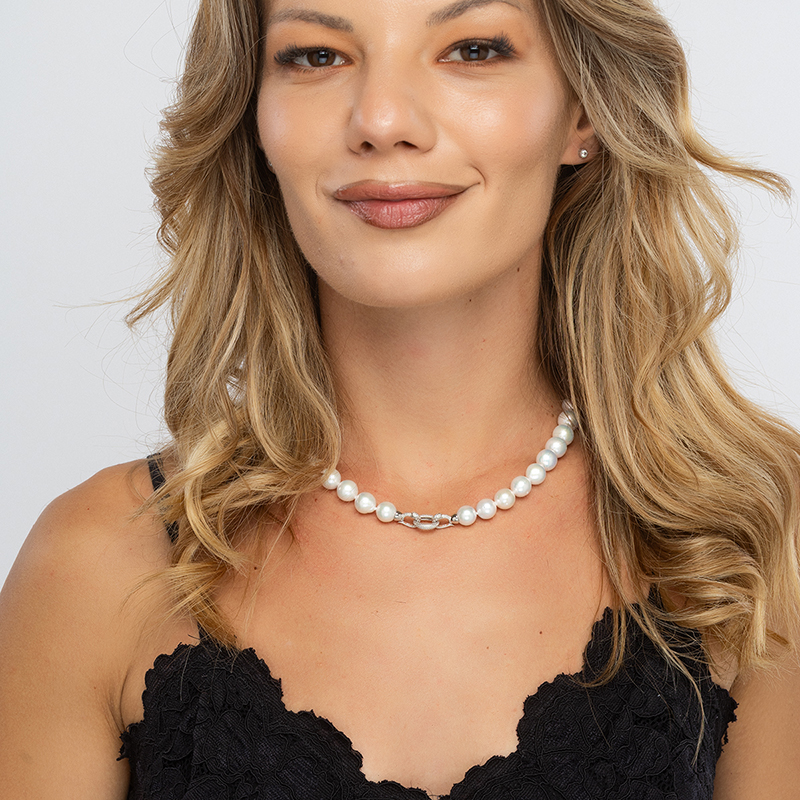 Тази огърлица е истинско бижу, което привлича погледа със своите големи сладководни перли с размер 10,5-11 мм. Всяка перла е с качество А+ с добър блясък и форма. Завършекът е още по-впечатляващ с дизайнерската закопчалка от родирано сребро 925. С изискан, плетен мотив и лесно закопчаване, тя е едновременно красива и практична, завършвайки перфектно това бижу с дължина 42 см.