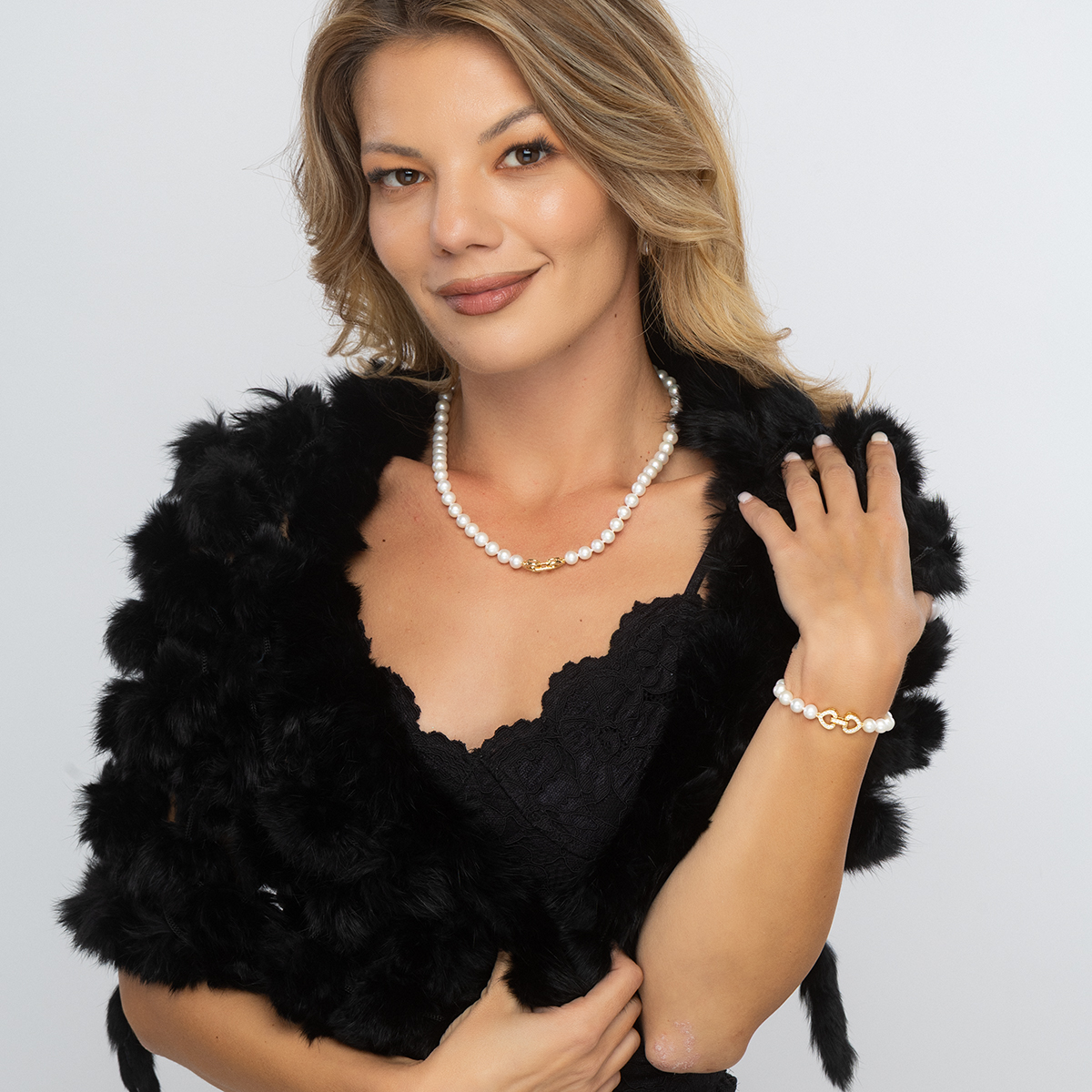 Тази огърлица със сладководни перли е модерна интерпретация на вечна класика. Кръглите перли (8-9 мм) са елегантни с много добро качество АА+. Погледът ви веднага ще бъде привлечен от отличителната дизайнерска закопчалка. Тя е ключов елемент, който привлича вниманието и отличава бижуто.