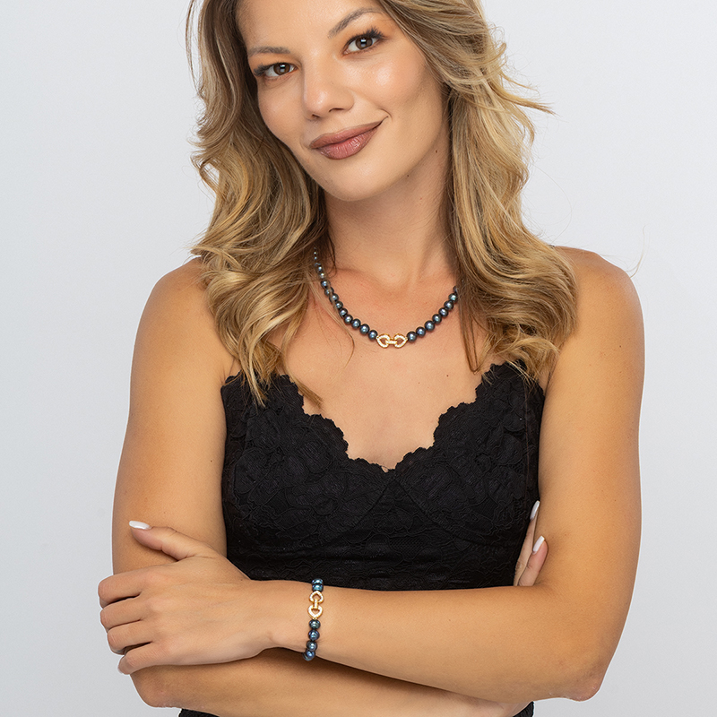 Тази огърлица със сладководни черни перли е модерна интерпретация на вечна класика. Кръглите перли (8-9 мм) са елегантни с много добро качество АА+. Погледът ви веднага ще бъде привлечен от отличителната дизайнерска закопчалка. Тя е ключов елемент, който привлича вниманието и отличава бижуто. Огърлицата се предлага в дължина 45 см.