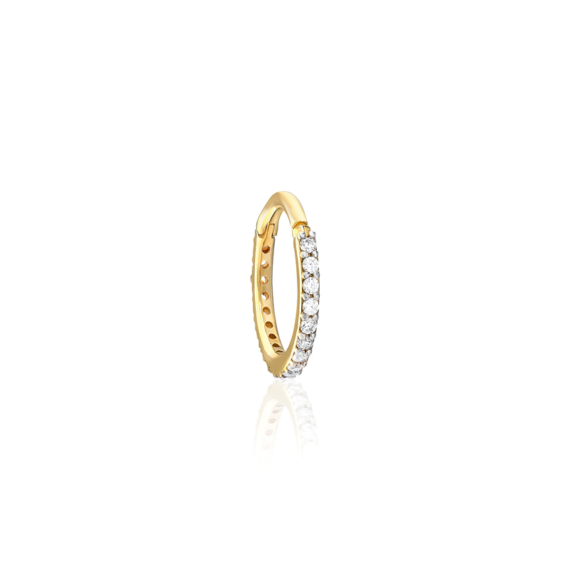 Този златен пиърсинг тип халка сияе с изключителна женственост и елегантност благодарение на множеството прецизно наредени циркониеви камъни. Всяко камъче е поставено така, че да улавя светлината от всеки ъгъл, създавайки впечатляващ блясък, който напомня на истински диаманти.