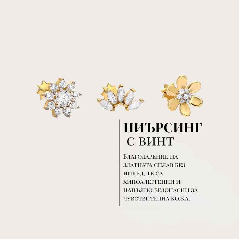 Този изящен пиърсинг за ухо впечатлява с модерната си, минималистична форма и красиво блестящ цирконий в центъра. Камъчето е обгрънато от фини златни детайли, които придават допълнителна дълбочина и блясък. Дизайнът е деликатен, но едновременно с това изключително стилен — идеален акцент за всяка изтънчена визия.
