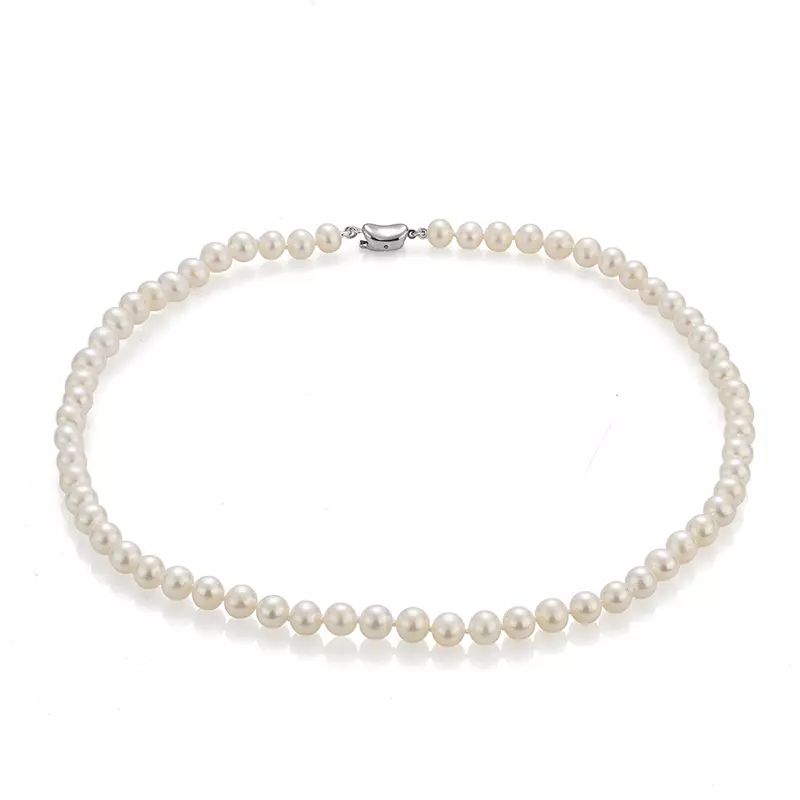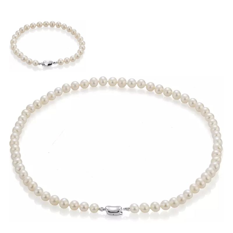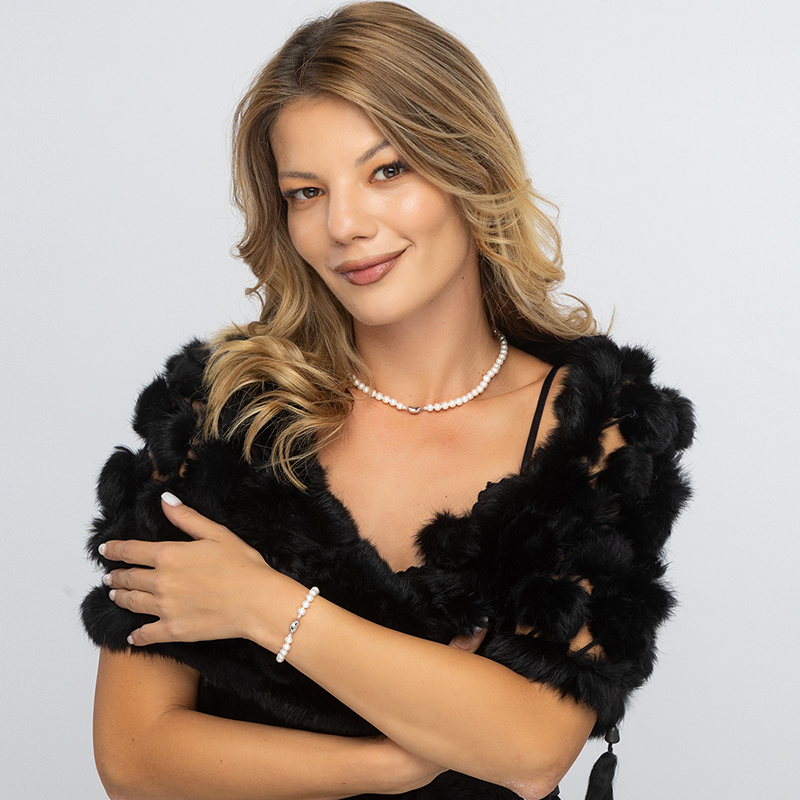 Тези огърлица и гривна със сладководни перли са модерна интерпретация на вечна класика. Кръглите перли (5.5 - 6 мм) са елегантни с много добро качество ААA. Погледът ви веднага ще бъде привлечен от отличителната дизайнерска закопчалка на огърлицата и гривната. Тя е ключов елемент, който привлича вниманието и отличава бижуто.