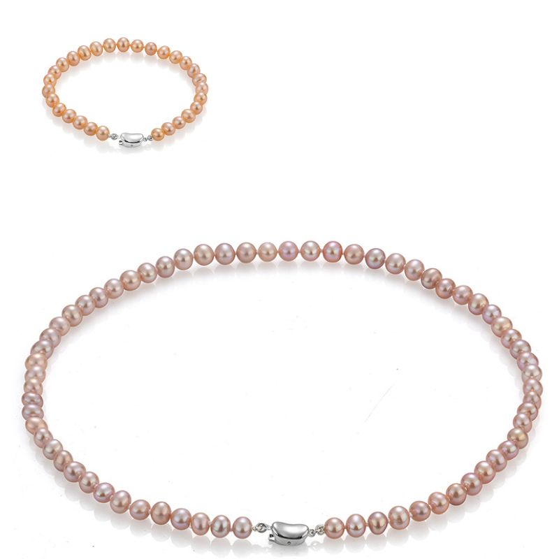 Тези огърлица и гривна със сладководни перли са модерна интерпретация на вечна класика. Кръглите перли (5.5 - 6мм) са елегантни с много добро качество ААA. Погледът ви веднага ще бъде привлечен от отличителната дизайнерска закопчалка на огърлицата и гривната. Тя е ключов елемент, който привлича вниманието и отличава бижуто.