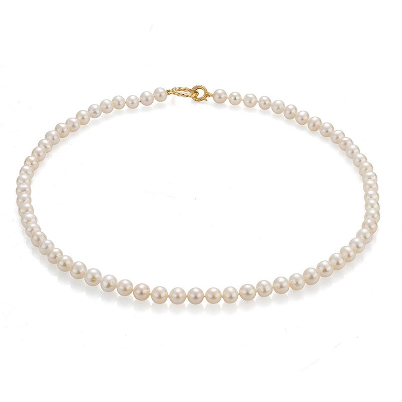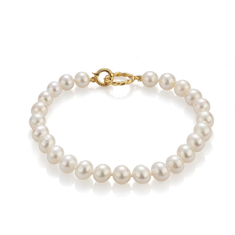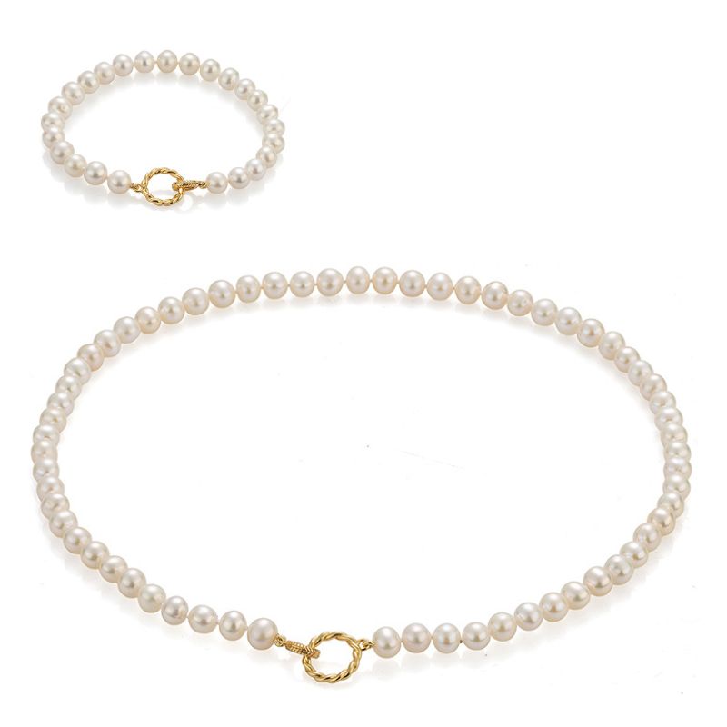Тези огърлица и гривна със сладководни перли са модерна интерпретация на вечна класика. Кръглите перли (7 - 8 мм) са елегантни с много добро качество ААA. Погледът ви веднага ще бъде привлечен от отличителната дизайнерска закопчалка на огърлицата и гривната. Тя е ключов елемент, който привлича вниманието и отличава бижуто.