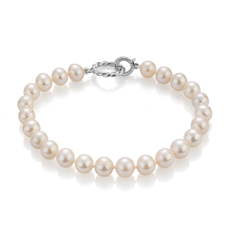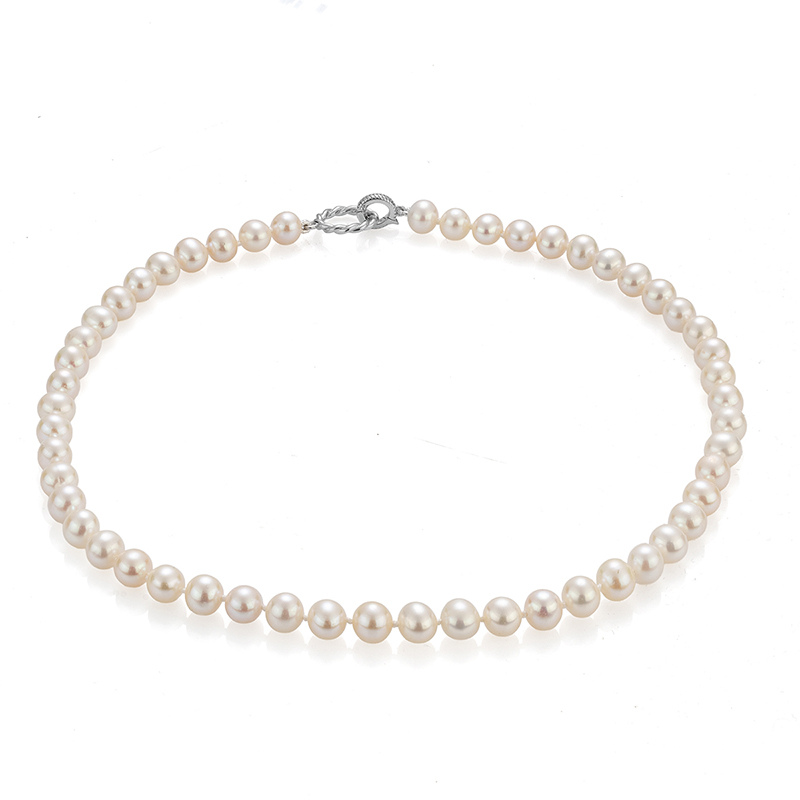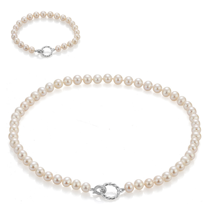 Тези огърлица и гривна със сладководни перли са модерна интерпретация на вечна класика. Кръглите перли (7-8 мм) са елегантни с много добро качество ААA. Погледът ви веднага ще бъде привлечен от отличителната дизайнерска закопчалка на огърлицата и гривната. Тя е ключов елемент, който привлича вниманието и отличава бижуто.