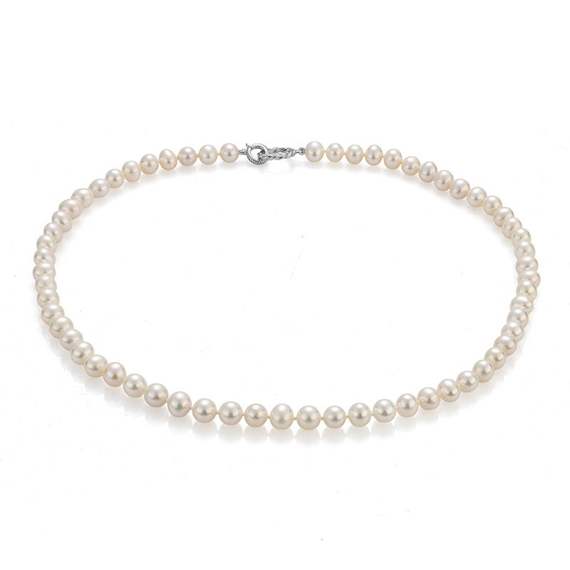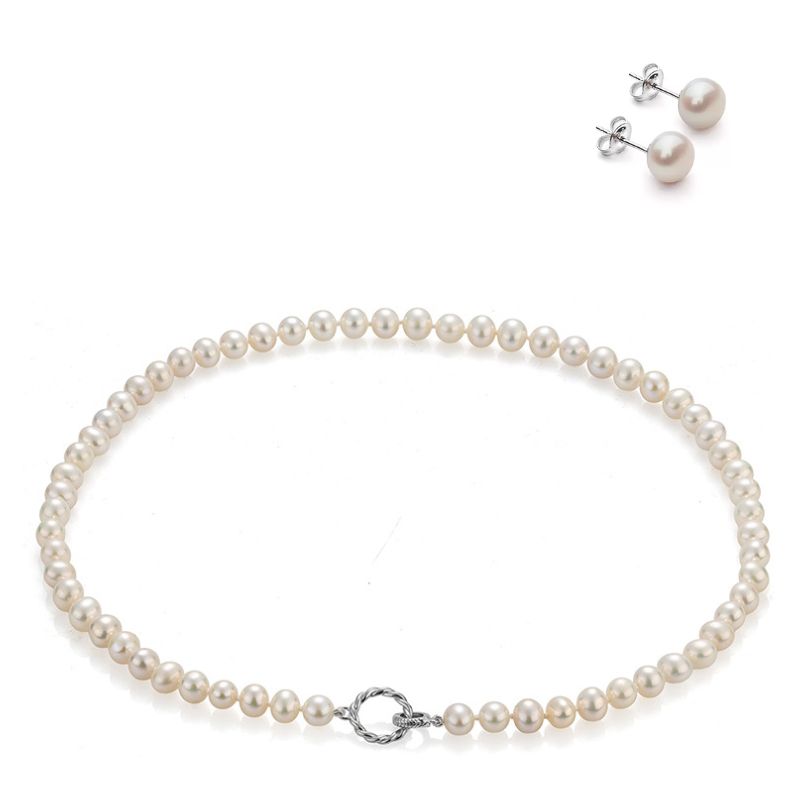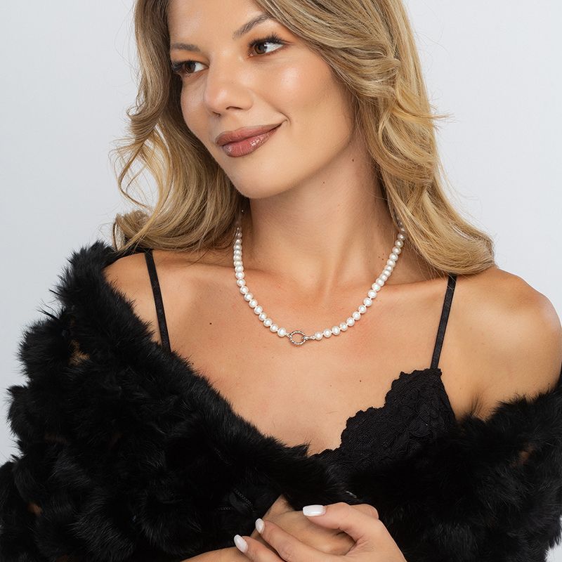 Тези огърлица и обеци със сладководни перли са модерна интерпретация на вечна класика. Кръглите перли (8-9 мм) са елегантни с много добро качество ААА. Погледът ви веднага ще бъде привлечен от отличителната дизайнерска закопчалка на огърлицата. Тя е ключов елемент, който привлича вниманието и отличава бижуто. Изберете своята дължина – 40 см или 45 см.