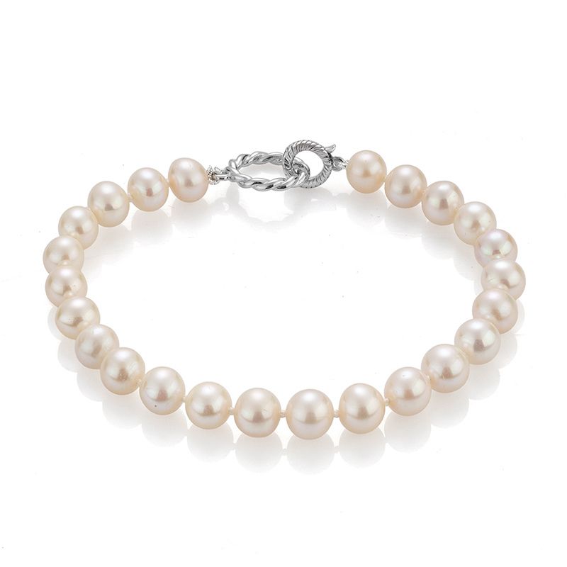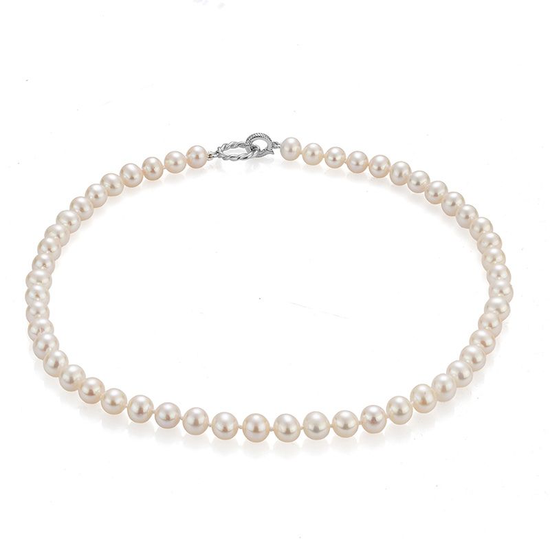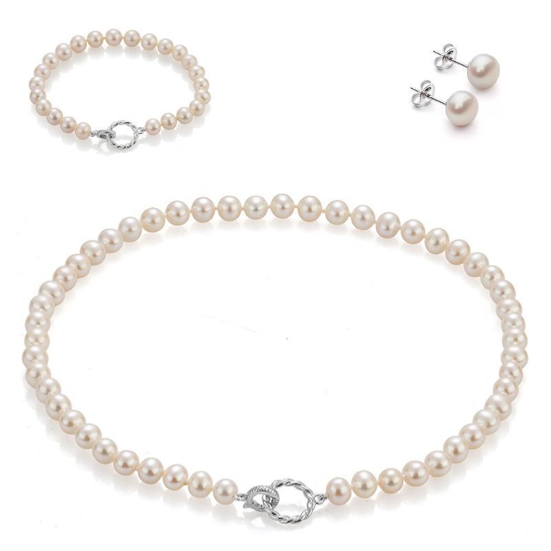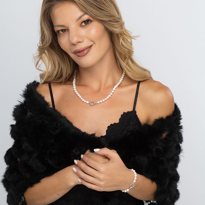 Тези огърлица, обеци и гривна със сладководни перли са модерна интерпретация на вечна класика. Кръглите перли (7-8 мм) са елегантни с много добро качество ААA. Погледът ви веднага ще бъде привлечен от отличителната дизайнерска закопчалка на огърлицата и гривната. Тя е ключов елемент, който привлича вниманието и отличава бижуто.