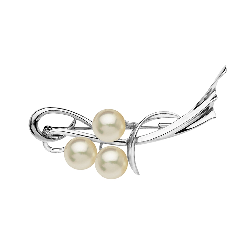 Тази брошка е изработена от сребро проба 925 с родиево покритие. Основният акцент в бижуто е композицията от три естествени морски перли Акоя. Известни като едни от най-престижните перли в света, те се отличават с перфектна сферична форма и изключително дълбок, огледален блясък. Повърхността им притежава характерен копринен сияен ефект с розови и кремави нюанси. Брошката е изработена със сигурно закопчаване, което позволява лесното ѝ поставяне върху ревери, шалове или официални облекла. Изтънчените детайли и сиянието на морските перли правят това бижу подходящо за дами, които ценят дискретния лукс.