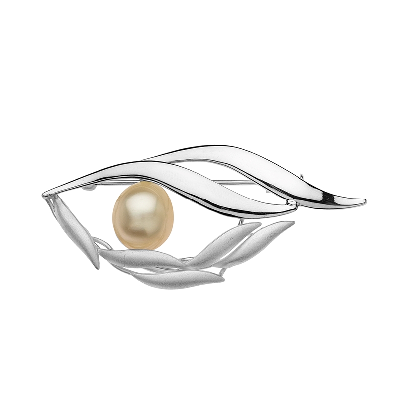 Тази брошка е изработена от сребро проба 925 с висококачествено родиево покритие. Централният елемент в композицията е голяма сладководна перла с нежен златист нюанс. Тя е внимателно подбрана заради своя плътен и копринен блясък, който улавя светлината и я отразява с мекота. Дизайнът обгръща перлата по начин, който подчертава нейната естествена форма и топъл цвят, превръщайки брошката в открояващ се аксесоар.
