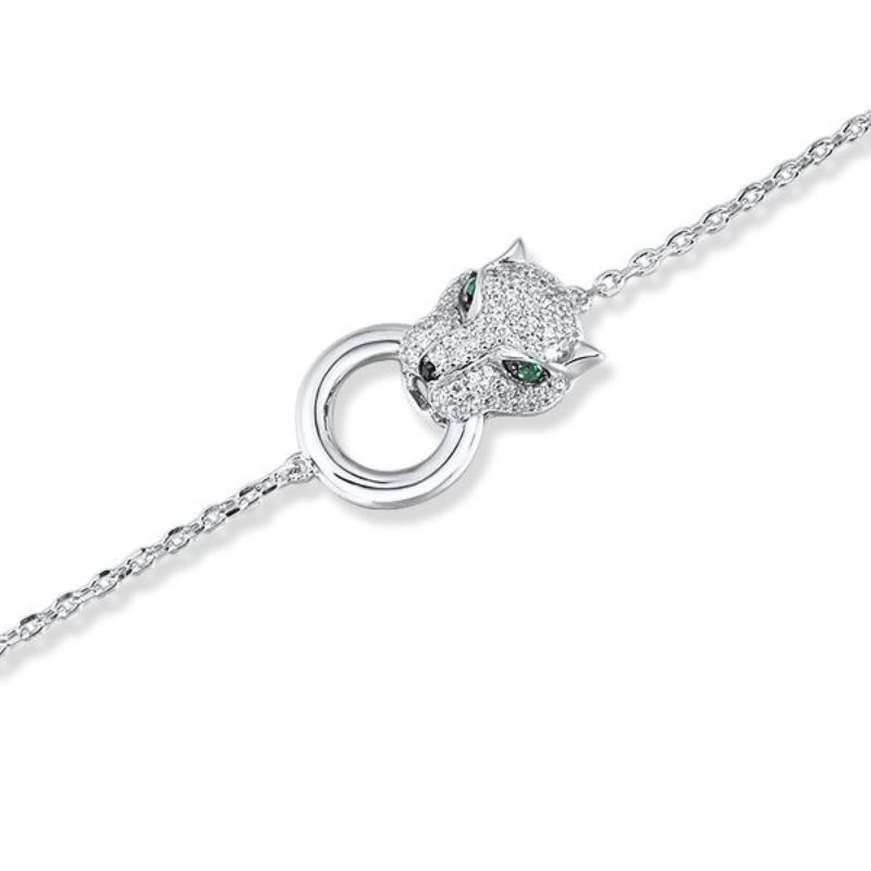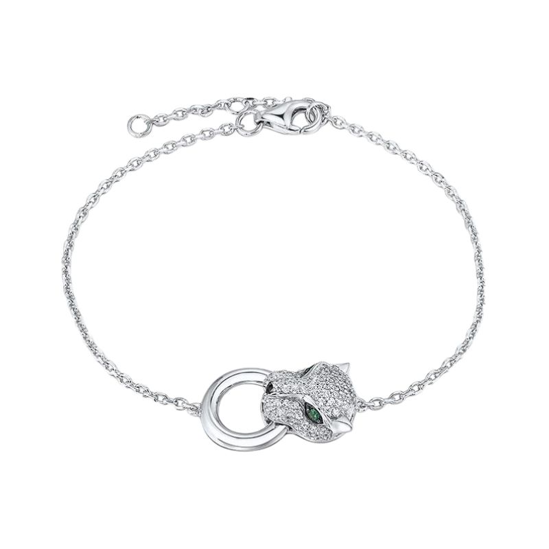 Тази елегантна гривна е изработена от сребро 925 и е с впечатляващ декоративен елемент във формата на глава на леопард, на която са инкрустирани черен и зелен шпинел, придаващи дълбочина и изразителност на бижуто. Стилният дизайн комбинира класическа верижка с ефектна халка, преминаваща през елемента, създавайки усещане за динамика и характер. Леопардът символизира увереност и независимост – акцент за жени, които обичат да изразяват себе си чрез детайла.