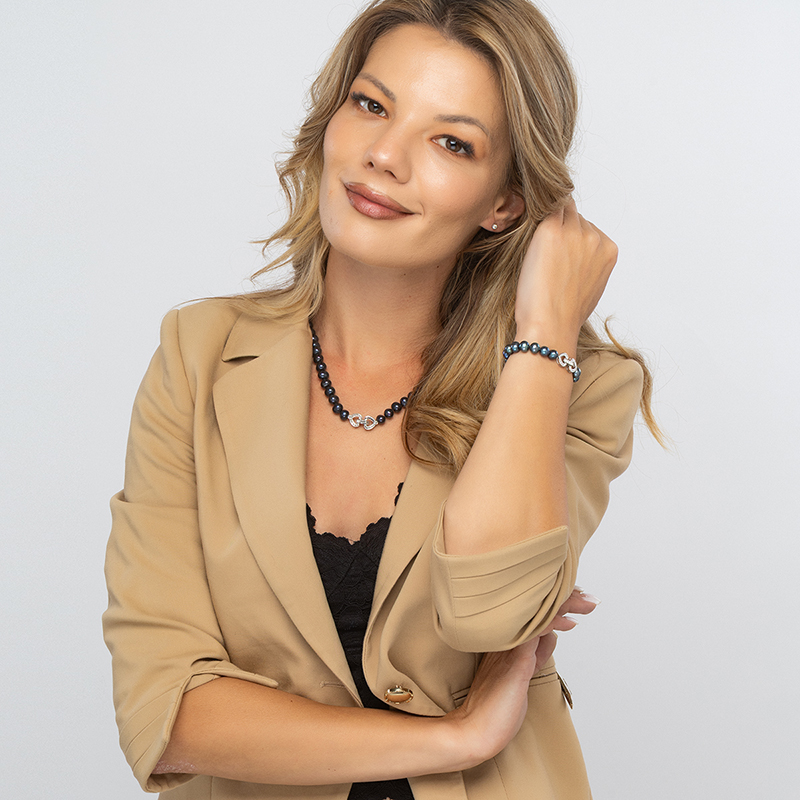 Тази гривна със сладководни черни перли е модерно бижу, създадено да впечатлява. Перлите с качество АА+ и размер 8-9 мм са гладки и изящни, но отличителният елемент е дизайнерската закопчалка. Тя представлява две вплитащи се сърца, обсипани с блестящи цирконий. Предлага се в размери с дължина 18 см.