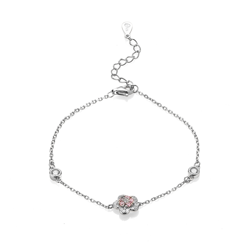 Гривната е изработена от висококачествено сребро проба 925 с родиево покритие. Дизайнът акцентира върху деликатно цвете, обсипано с наситени розови камъни. Цветето е заобиколено от цирконий с прецизна шлифовка тип брилянт, които улавят светлината и внасят дискретно сияние при всяко движение.