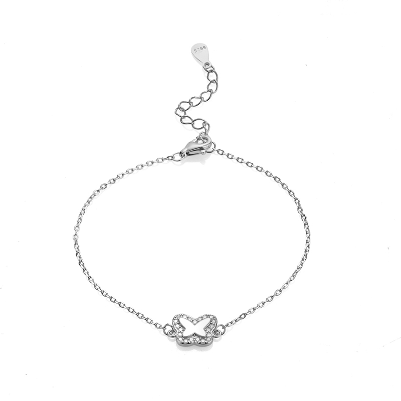 Тази гривна е изработена от висококачествено сребро проба 925 с родиево покритие. В центъра на верижка е разположено деликатна пеперуда, инкрустирана с плочка от естествен бял седеф. Седефената пеперуда е обгърната от нежен ореол от искрящи цирконий с прецизна шлифовка тип брилянт, които улавят светлината и внасят дискретно сияние при всяко движение. Благодарение на своята фина изработка, сребърната гривната приляга нежно към китката и добавя деликатност към визията, превръщайки я в идеален подарък за любим човек.