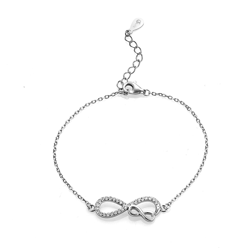 Тази деликатна гривна, изработена от висококачествено сребро проба 925, е красиво превъплъщение на символа за вечността. Дизайнът акцентира върху двоен мотив на безкрайността, който съчетава изчистени сребърни линии с нежно инкрустирани цирконий.