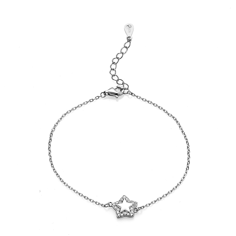 Тази гривна е изработена от висококачествено сребро проба 925 с родиево покритие. Дизайнът се отличава с централен елемент във формата на звезда, инкрустирана с нежна плочка от естествен бял седеф.