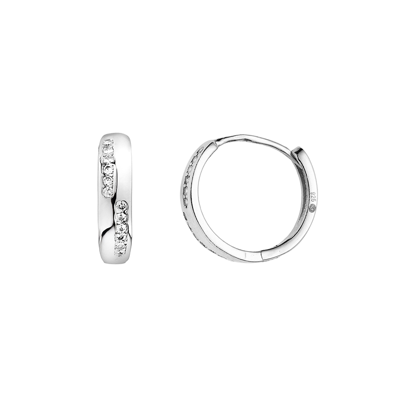 Тези обеци са изработени от сребро проба 925 с родиево покритие. Дизайнът е с класическа и модерна форма на халки, подчертана от интензивен блясък и прецизна инкрустация.