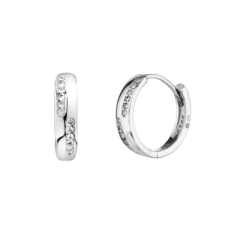 Централният елемент представлява хоризонтално заподредени цирконий. Родиевото покритие на среброто осигурява дълготрайна защита от потъмняване. Сребърните обеци са със стабилно закопчаване тип халка, което е удобно и добро решение за ежедневно носене.