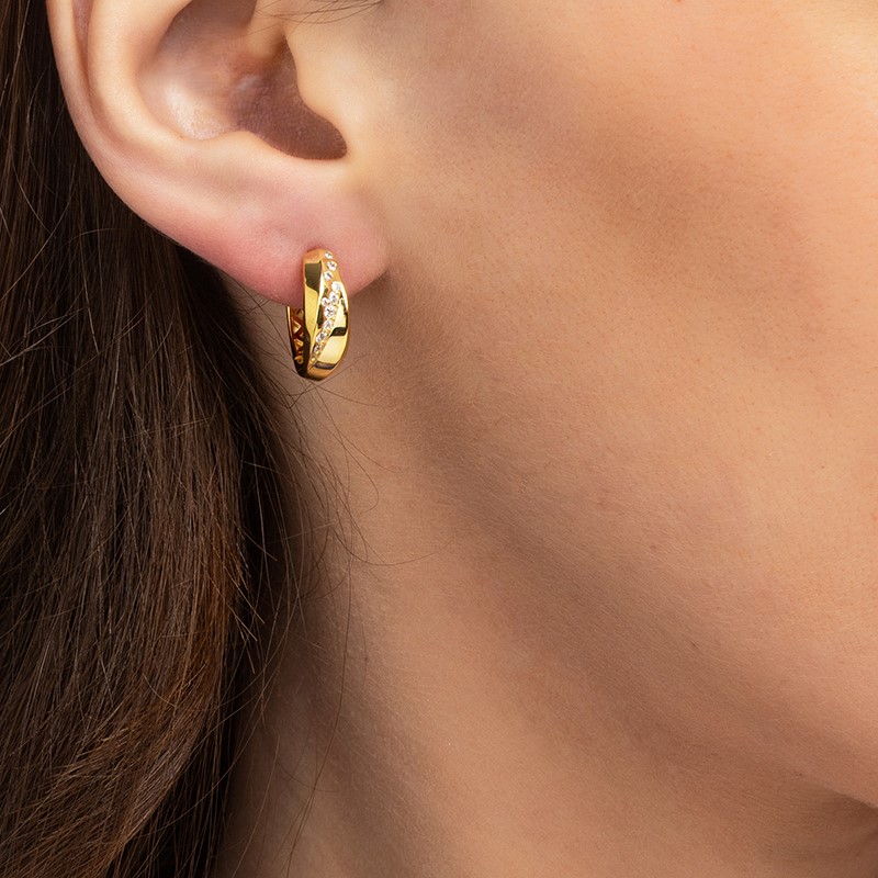 Тези сребърни халки са изработени с 3 микрона позлата от 14 карата жълто злато и се отличават с елегантна извита форма, подчертана от деликатно инкрустирани цирконий. Блясъкът им е фин и изразителен, за да добави акцент към дизайна. Закопчаването е стабилно и удобно, което прави обеците подходящи както за ежедневието, така и за специални поводи.