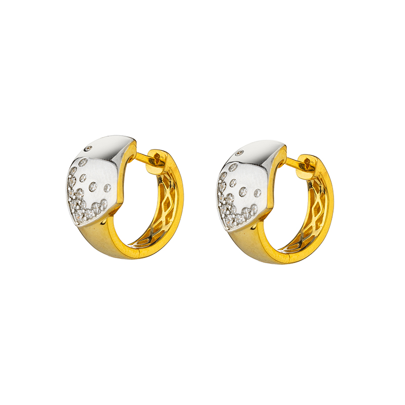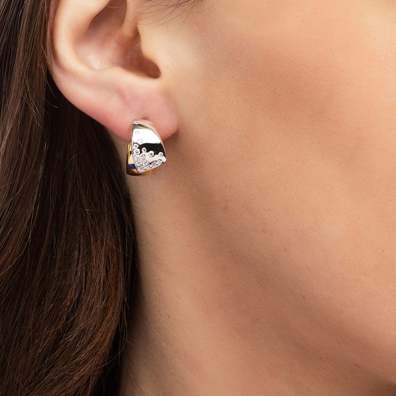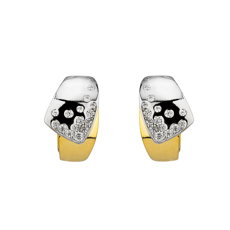 Дизайнът на тези обеци умело преплита сребро с деликатно позлатени детайли, създавайки ефектен визуален контраст и усещане за дълбочина. Повърхността на бижуто е прецизно полирана, което осигуряват огледален блясък, отразяващ светлината при всяко движение. Фините акценти от искрящи камъни, разпръснати по сребристата част, добавят дискретно очарование и завършват композицията.