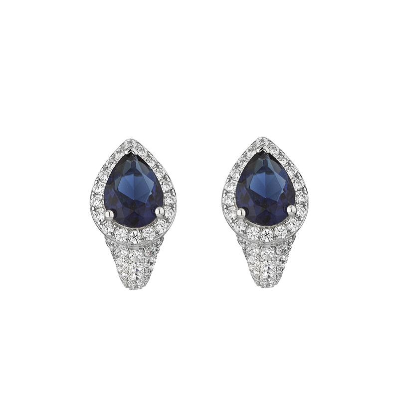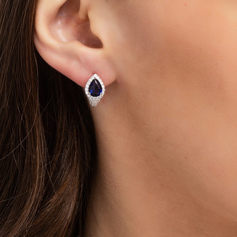 Тези деликатни сребърни обеци, изработени от сребро проба 925, пленяват със своят небесен цвят. В центъра на дизайна е поставен тъмносин капковиден цирконий с изящна шлифовка. Основният камък е нежно рамкиран от ореол от малки цирконий, които подчертават неговата дълбочина и внасят дискретно сияние при всяко движение.