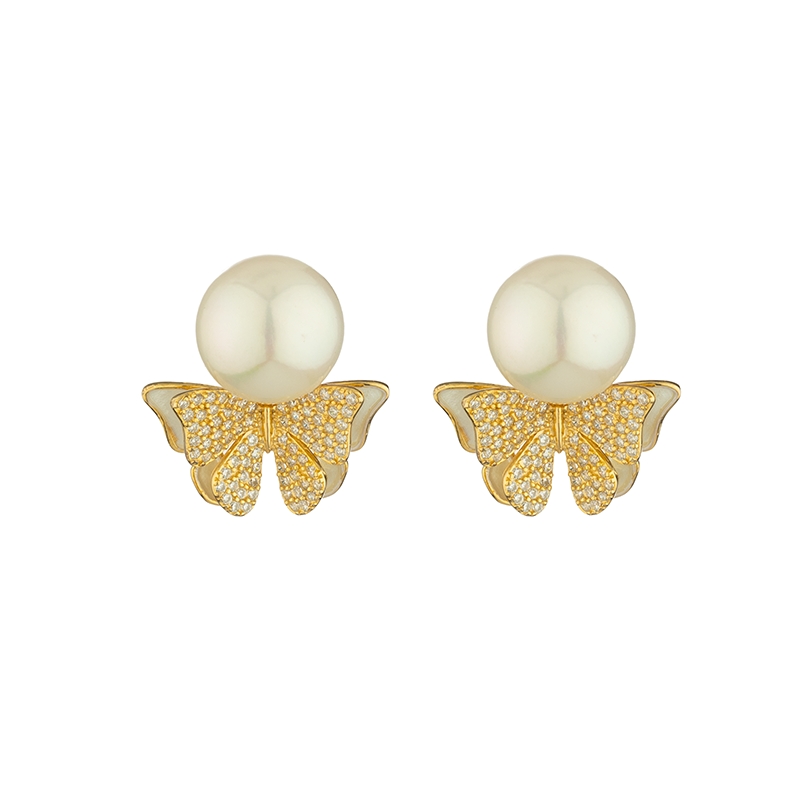 Тези обеци на Swan Pearls са изработени от сребро проба 925 с висококачествено покритие от 3 микрона позлата. Основният акцент са едри сладководни перли Edison с впечатляващ размер от 11-12 мм. Тези перли са известни със своята почти перфектна сферична форма и изключително интензивен, огледален блясък. Повърхността им се отличава със седефен слой, който отразява светлината с дълбочина и мекота. Елементът под формата на пеперуда добавя детайлност и превръща бижуто в открояващ се акцент.