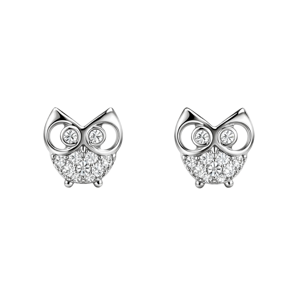 Тези обеци са изработени от сребро проба 925 с родиево покритие. Дизайнът залага на стилизирана и деликатна форма на бухал, подчертана от интензивен блясък и прецизна инкрустация.
