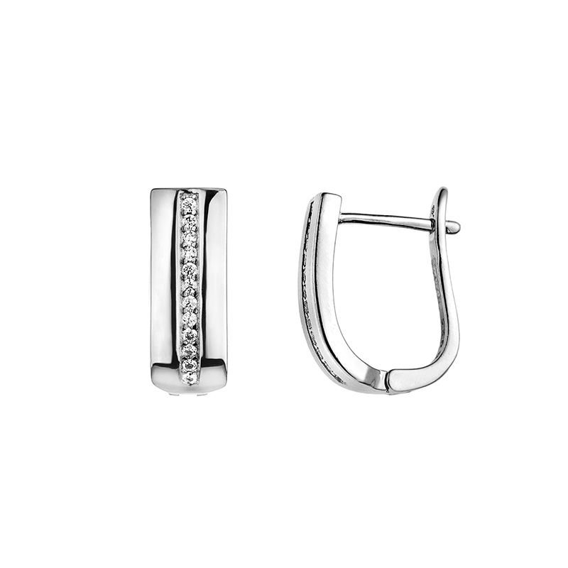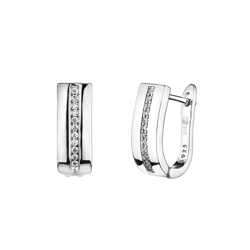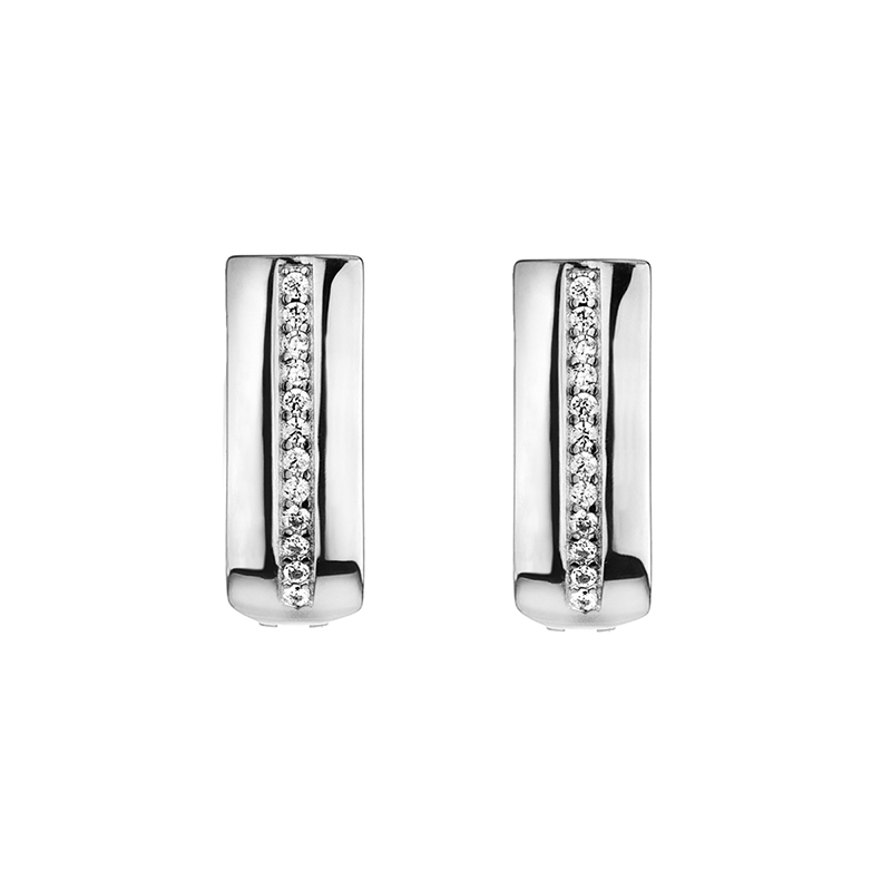 Тези обеци са изработени от сребро проба 925 с родиево покритие. Дизайнът залага на изчистена правоъгълна форма, подчертана от интензивен блясък и прецизна инкрустация.