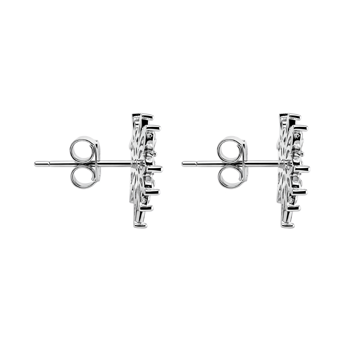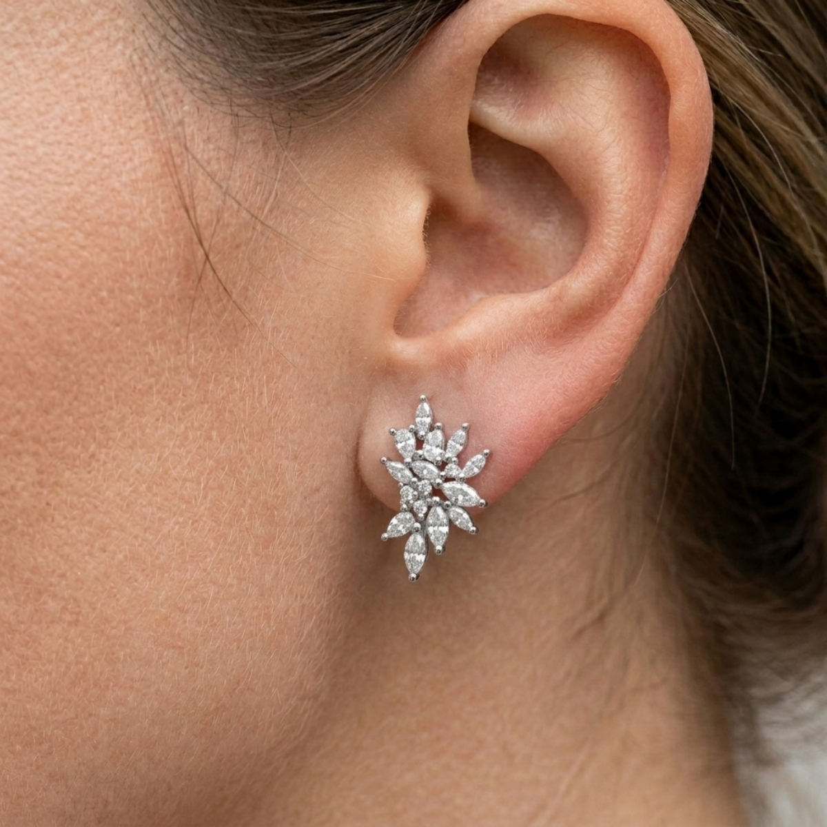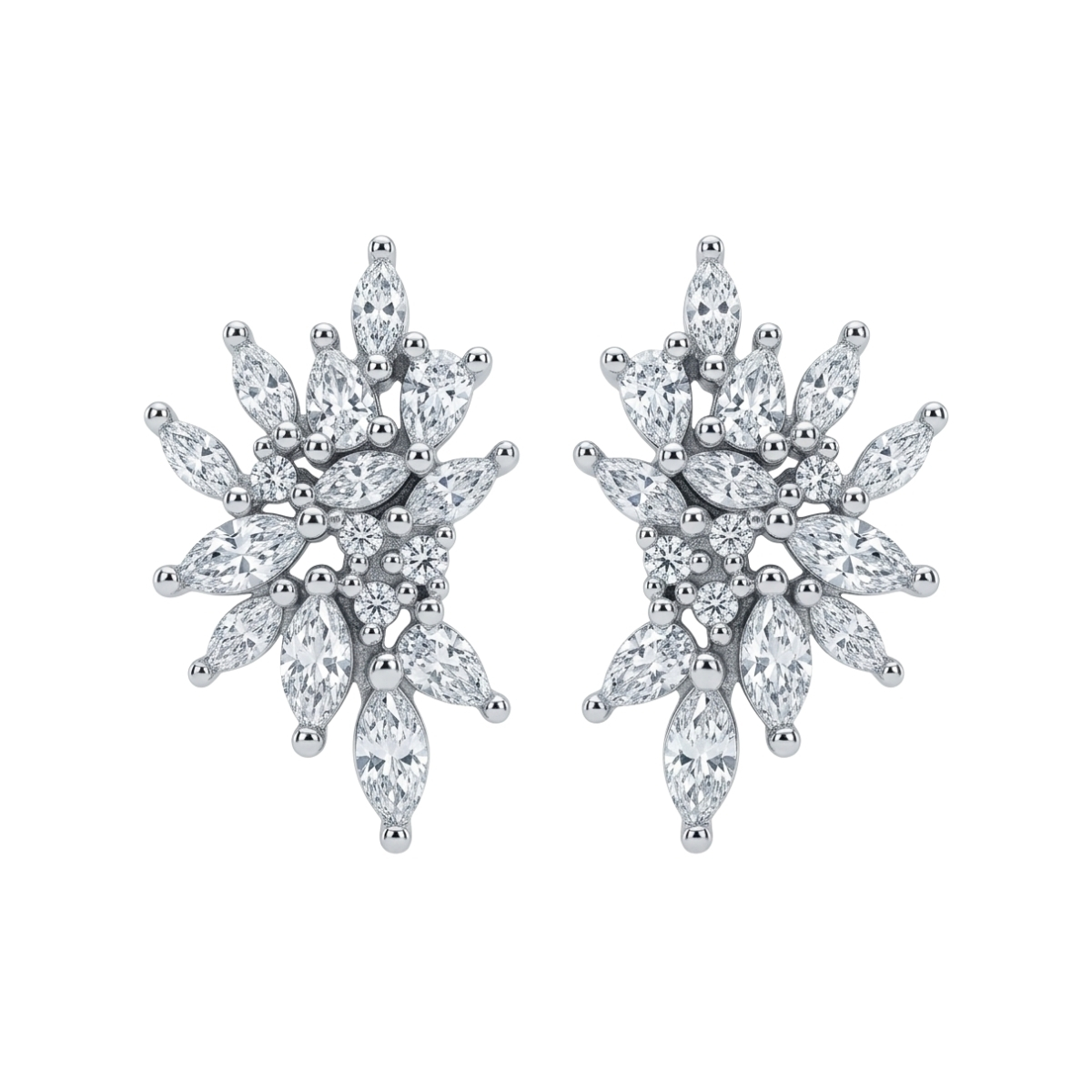 Моделът се отличава с асиметрична композиция. Декоративният елемент е изграден от множество цирконий с шлифовка тип „маркиз“, които са подредени ветрилообразно, за да улавят светлината от всеки ъгъл. В центъра са добавени малки кръгли камъни, които завършват детайла и му придават допълнителен обем. Сребърните обеци са със закопчаване на винт, което е удобно и сигурно решение за ежедневно носене.