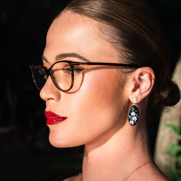 На черния фон са изрисувани нежни бели орхидеи, символ на изтънченост и красота. За допълнителен блясък, върху обеците са инкрустирани зелен шпинел, който допълва хармонията между цветовете и придава завършеност на композицията.