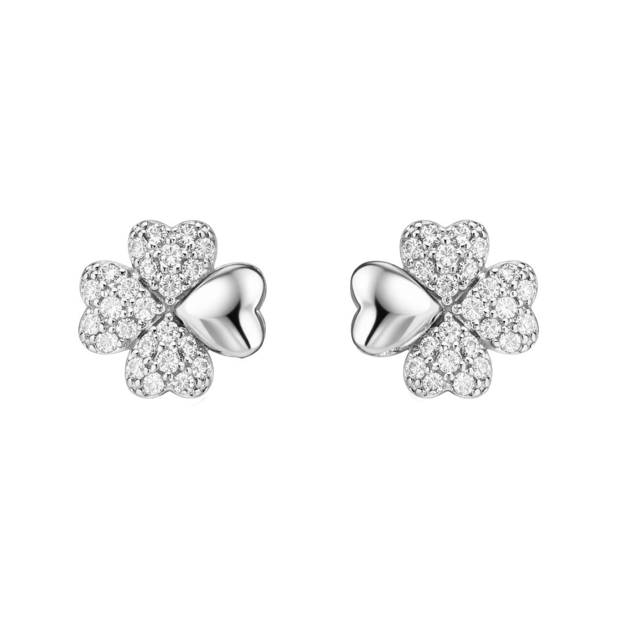 Тези обеци са изработени от сребро проба 925 с родиево покритие. Дизайнът е с класическа романтична форма на четирилистни детелини, подчертана от интензивен блясък и прецизна инкрустация.