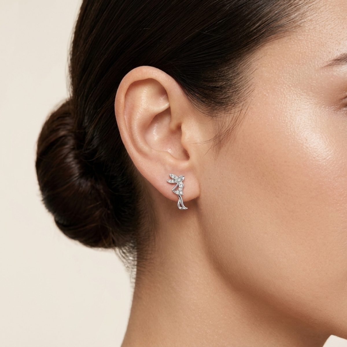 Централният елемент представлява нежна фигура на фея, обгърната от деликатен ореол от малки искрящи камъни по крилата и роклята. Всички камъни са с шлифовка тип брилянт. Родиевото покритие на среброто осигурява дълготрайна защита от потъмняване. Сребърните обеци са със закопчаване на винт, което е удобно и сигурно решение за ежедневно носене. Олекотеният дизайн и надеждното затваряне правят модела отличен избор за дете.