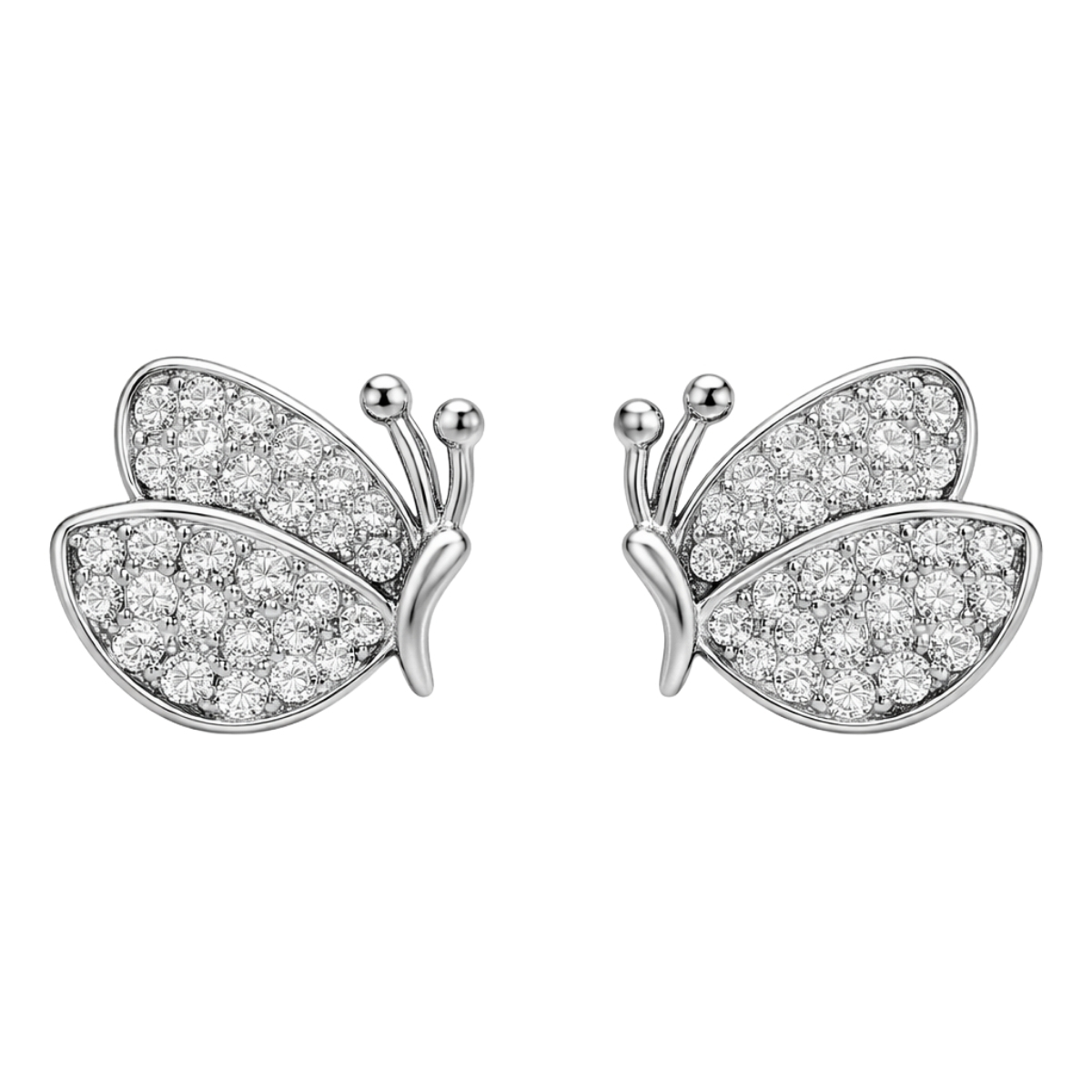 Всеки елемент представлява деликатно оформена пеперуда в полет, чиито крила са изцяло обсипани с множество малки искрящи цирконии. Гладката сребърна основа подчертава контурите на силуета, придавайки му завършен и елегантен вид. Родиевата обработка на среброто осигурява дълготрайна защита от потъмняване. Сребърните обеци са със закопчаване на винт, което е удобно и сигурно решение за ежедневно носене.