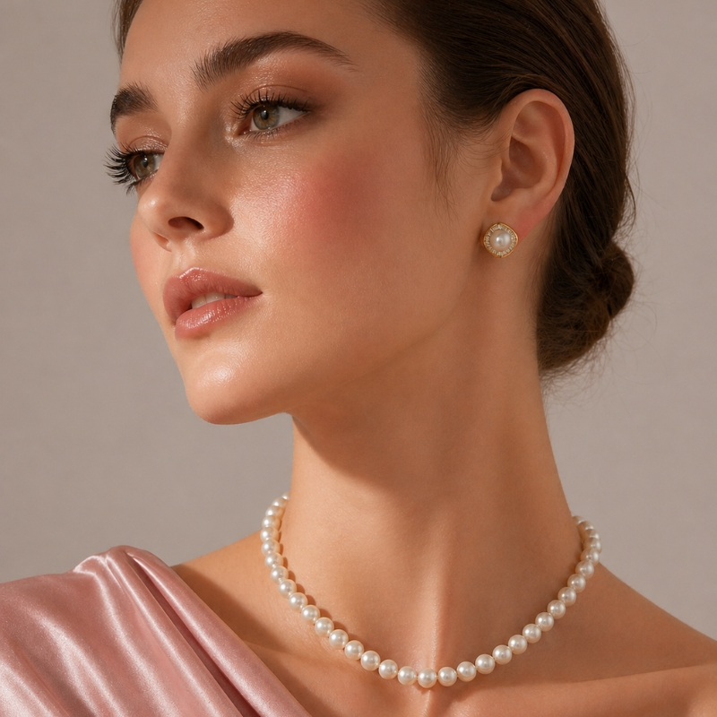 На тези обеци са поставени соленоводни перли Акоя с качество АА+. Те са с кръгла форма и размер 8-9 мм. Перлите Акоя са сред най-ценените в света. Техният блясък е огледален и се приема за най-интензивен сред всички видове. Класическият бял цвят е с лек розов оттенък, което ги отличава и превръща в символ на изисканкия стил.
