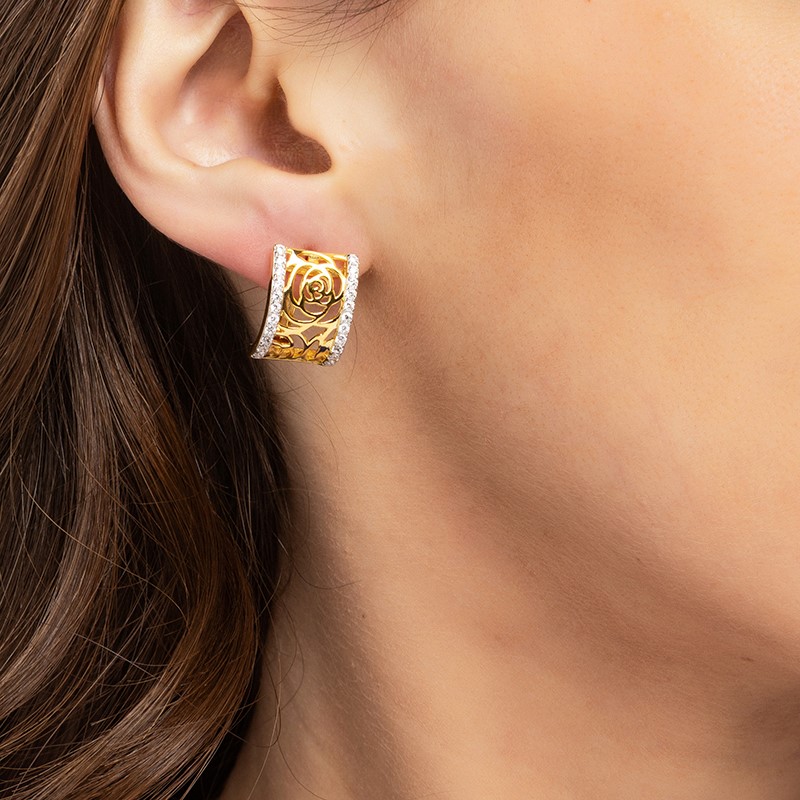 Тези изящни обеци, изработени от сребро проба 925 с позлата, пренасят изтънчеността на природата в ювелирния дизайн. В центъра на композицията са разположени детайлно изработени рози с нежни венчелистчета.