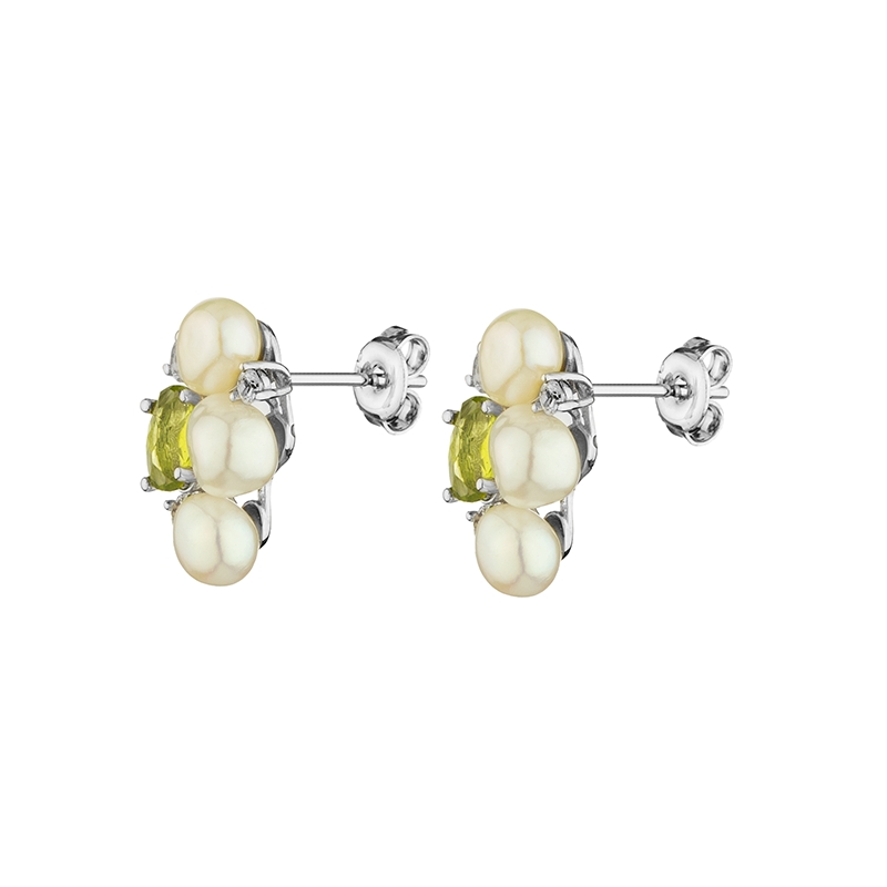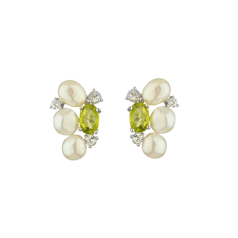 В центъра на дизайна е поставен естествен перидот с овална шлифовка с ярък маслиненозелен нюанс. За допълнително сияние, визията е завършена с два бели топаза на всяка обеца, разположени около централните елементи. Всички камъни са с висококачествена шлифовка, която пречупва светлината по фин начин.