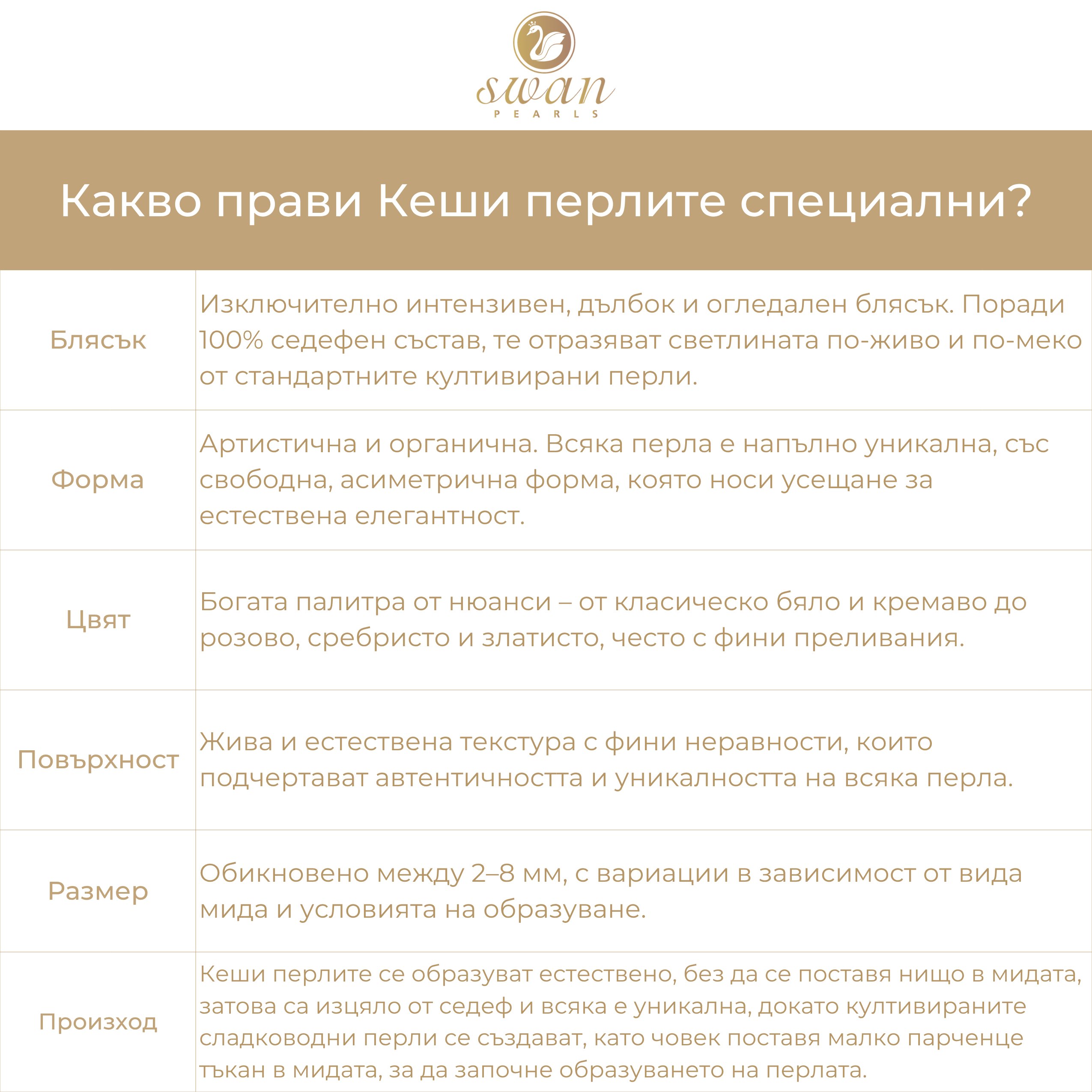 Дизайнът на всяка обеца включва три естествени кеши перли. Те се отличават с изключително интензивен, дълбок и огледален блясък. Поради своя 100% седефен състав, те отразяват светлината по-живо и по-меко от стандартните култивирани перли. Всяка перла е напълно уникална, със свободна, асиметрична форма. Те се образуват естествено в мидата без външна намеса, което носи усещане за естествена елегантност.