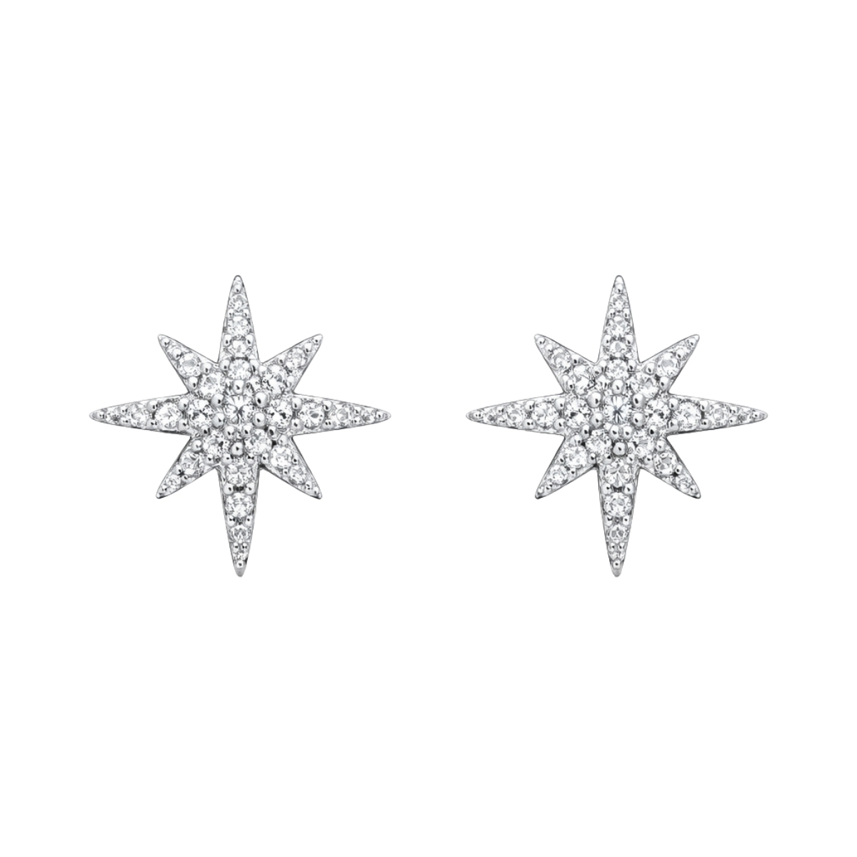 Тези обеци са изработени от сребро проба 925 с родиево покритие. Декоративният елемент представлява звезда, като всеки лъч е внимателно оформен и инкрустиран с множество малки искрящи камъни. В центъра на композицията е разположен акцентен цирконий, който обединява линиите и придава допълнителна дълбочина на сиянието. Родиевата обработка на среброто осигурява дълготрайна защита от потъмняване. Сребърните обеци са със закопчаване на винт, което е удобно и сигурно решение за ежедневно носене.