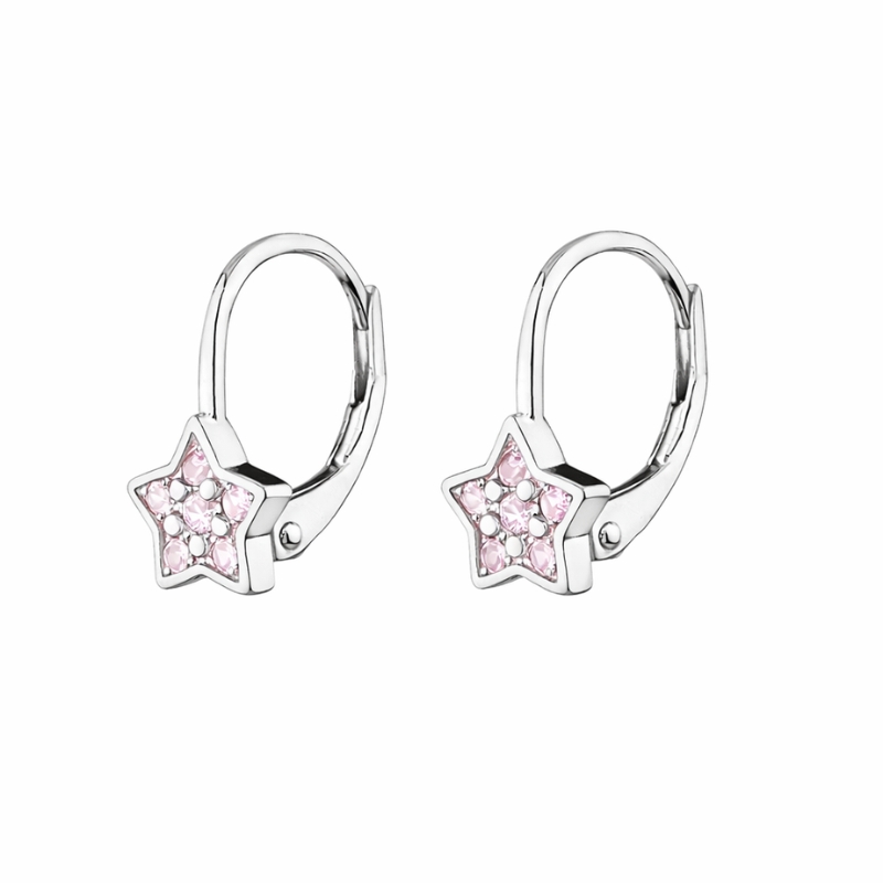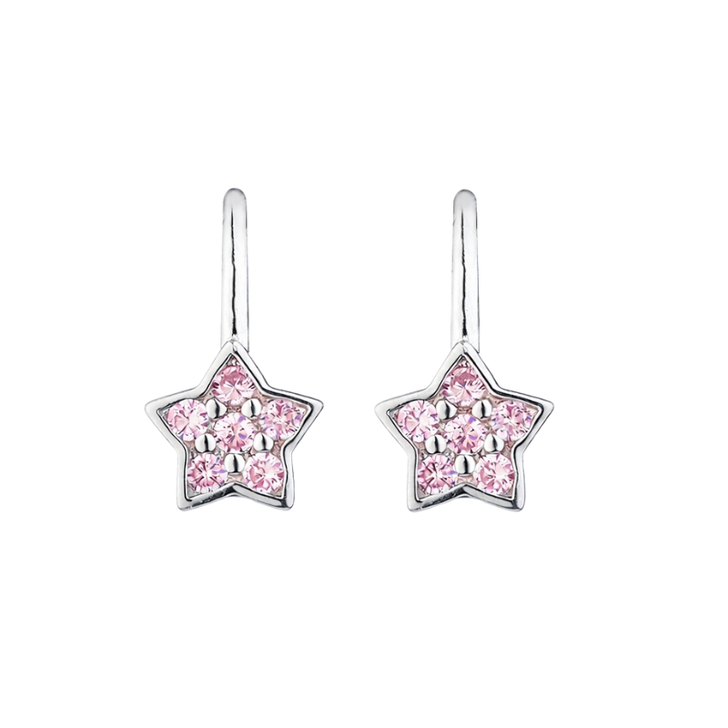 Нежни обеци звезди с инкрустирани розови цирконий е изработени от висококачествено родирано сребро, което блести магнетично. Обеците са с практична закопчалка, така че да могат лесно и удобно да се поставят на детските уши.