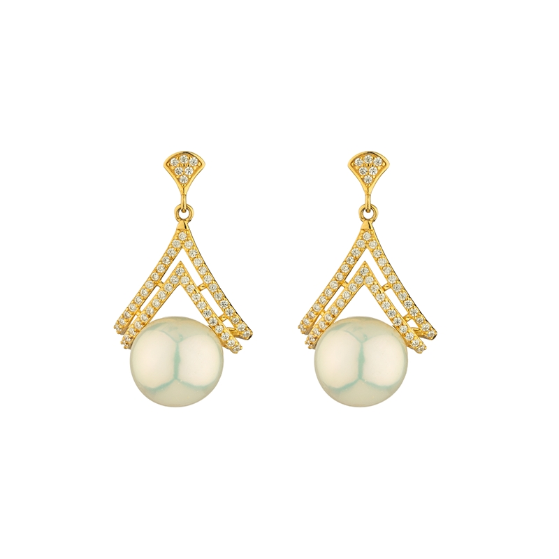 Тези обеци с перли на Swan Pearls са изработени от сребро проба 925 с висококачествено покритие от 3 микрона позлата. Моделът се отличава с модерна геометрична форма, инкрустирана с прецизно подредени камъни, които подчертават златния блясък. Основният акцент в дизайна са едрите сладководни перли Edison с впечатляващ размер от 10-11 мм. Тези перли са високо ценени заради своята перфектна сферична форма и изключително интензивен, огледален блясък. Повърхността им притежава седефен слой, който улавя светлината и я отразява с дълбочина и мекота, типични за най-високия клас бижута.
