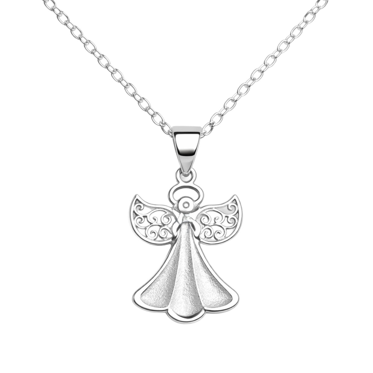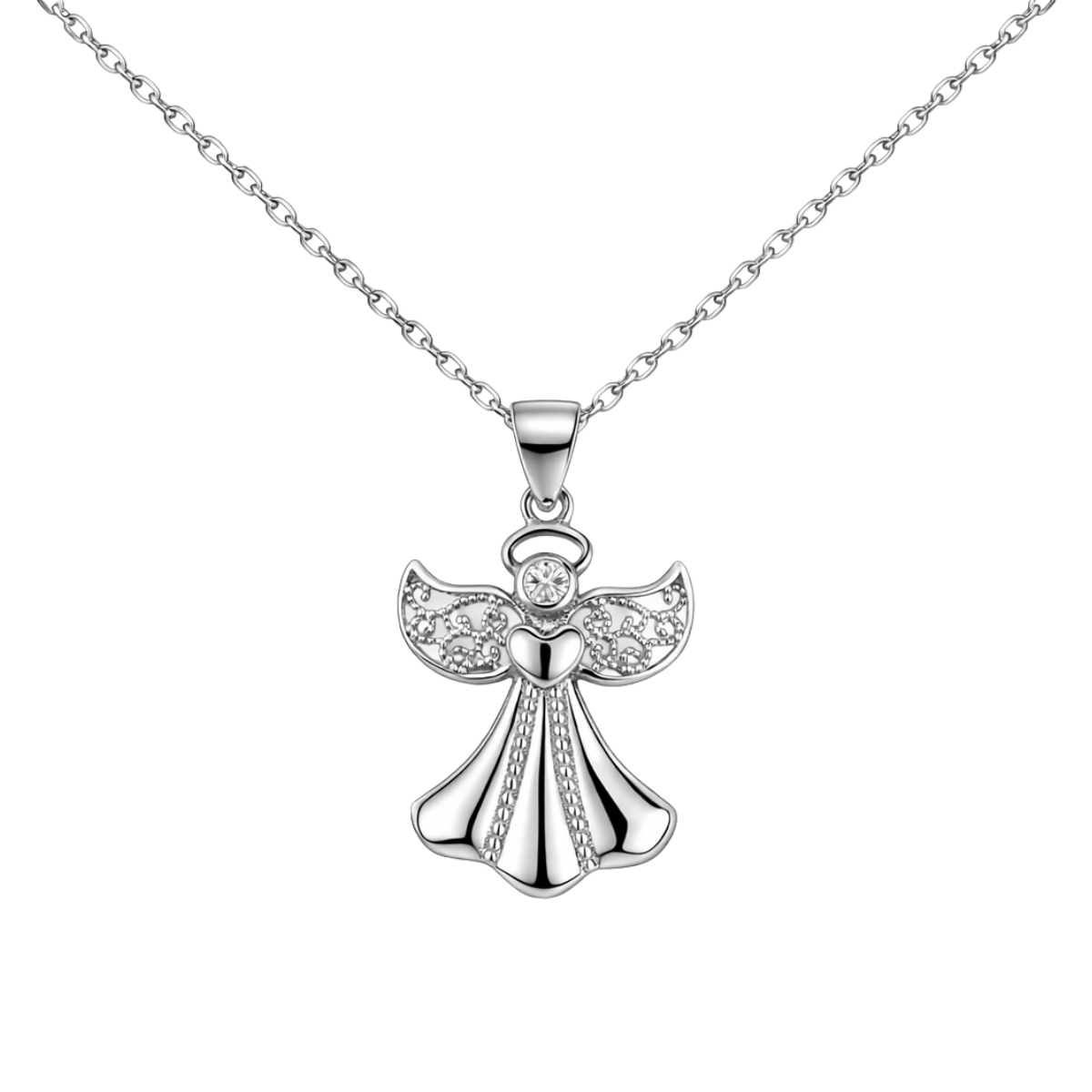 Висулката изобразява ангел с разперени крила, който държи малко сърце в ръцете си. Крилата са декорирани с елементи, които придават ефирност на бижуто, а главата е акцентирана от искрящ бял цирконий. Всички камъни са с шлифовка тип брилянт. Родиевата обработка на среброто осигурява дълготрайна защита от потъмняване. Колието включва деликатна сребърна верижка с класическа плетка.