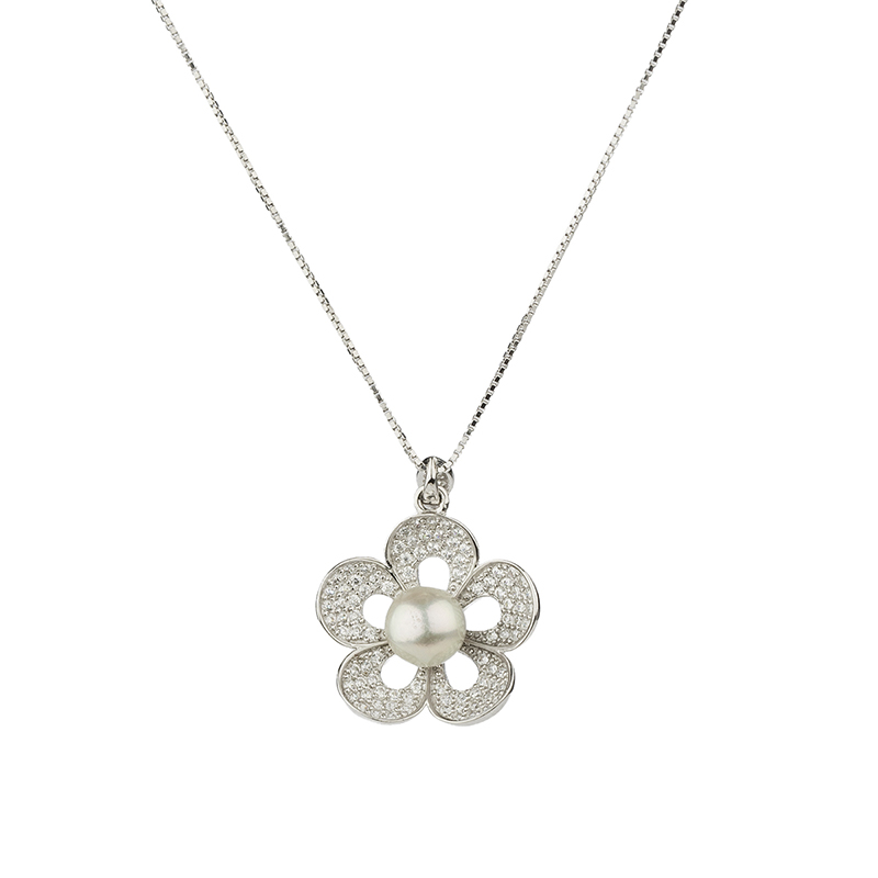 Това колие е изработено от сребро проба 925 с родиево покритие. Дизайнът се отличава с деликатна форма на цвете, подчертано от прецизна изработка, която насочва вниманието изцяло към естественото сияние на перлата.