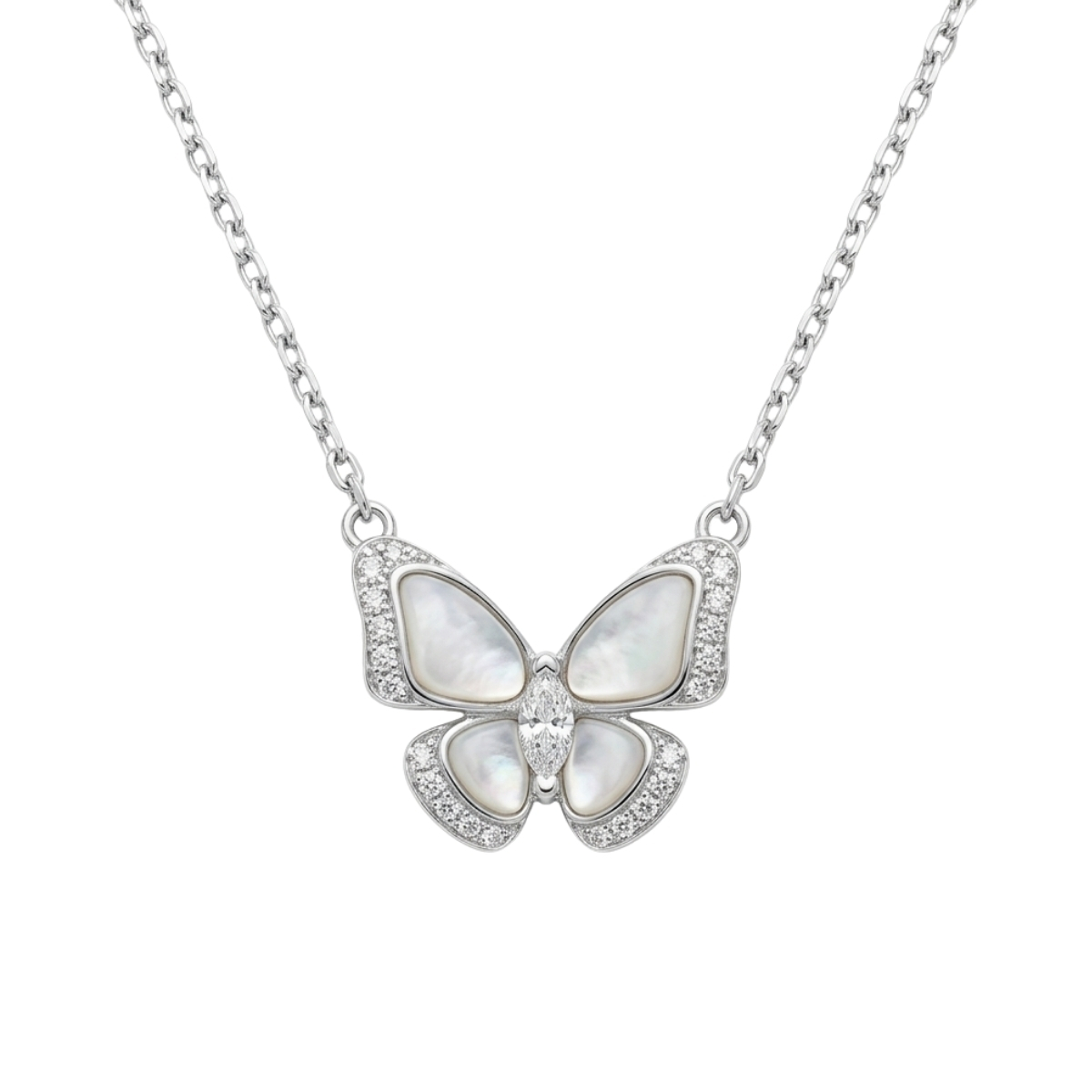 Това колие е изработено от сребро проба 925 с родиево покритие. Висулката представя стилизирана пеперуда, чиито крила са изпълнени с естествен бял седеф, придаващ на бижуто нежност. Центърът и долната част на крилата са акцентирани от множество блестящи камъни, които подчертават контурите и добавят сияние при всяко движение. Всички цирконии са с шлифовка тип брилянт. Родиевата обработка на среброто осигурява дълготрайна защита от потъмняване.