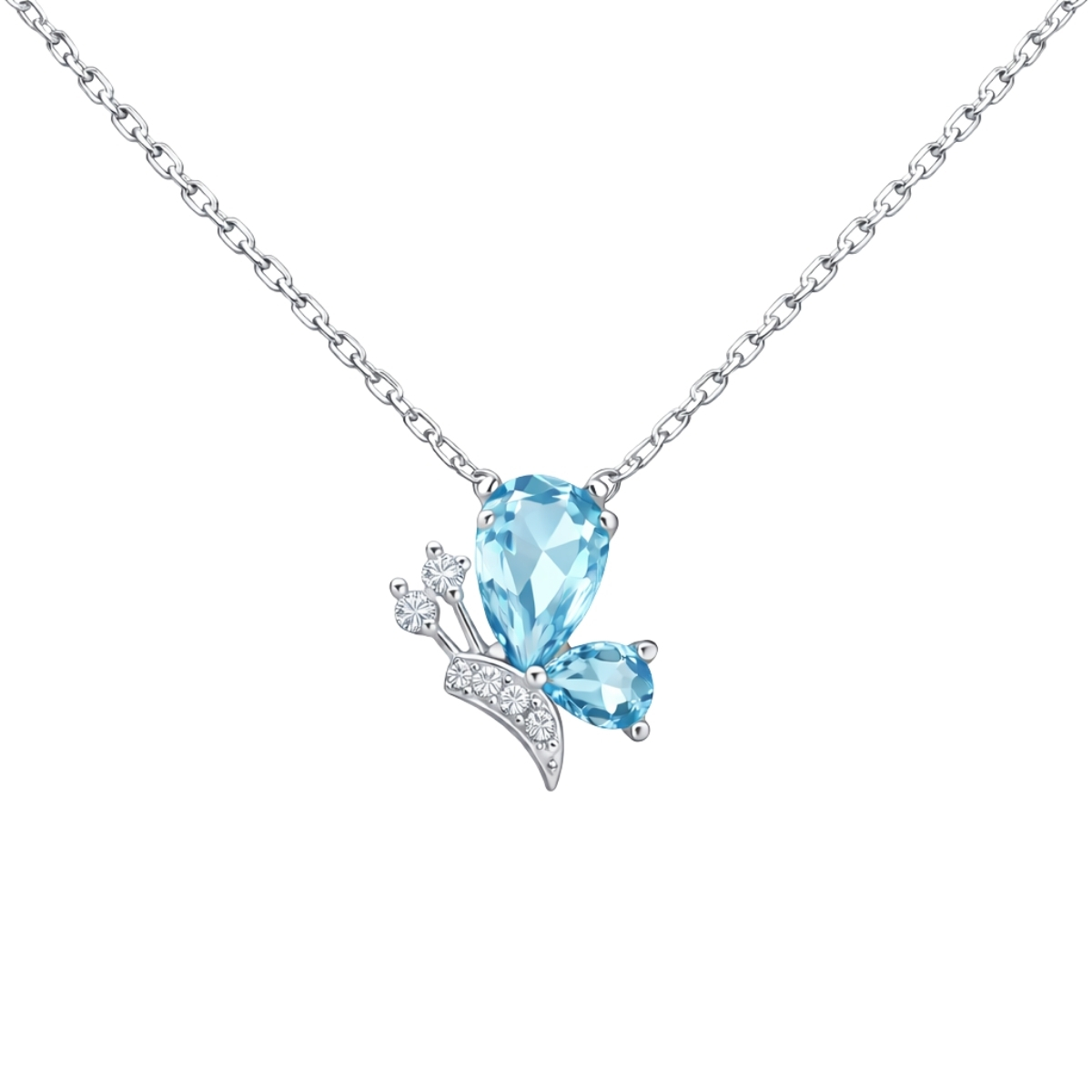Централният елемент изобразява пеперуда в полет, чиито крила са акцентирани от сини цирконии с различна наситеност и форма, придаващи дълбочина на композицията. Всички цирконии са с шлифовка тип брилянт за дискретно сияние при всеки досег със светлината. Родиевата обработка на среброто осигурява дълготрайна защита от потъмняване. Висулката е окачена на класическа сребърна верижка с прецизна плетка, която осигурява комфорт при носене.