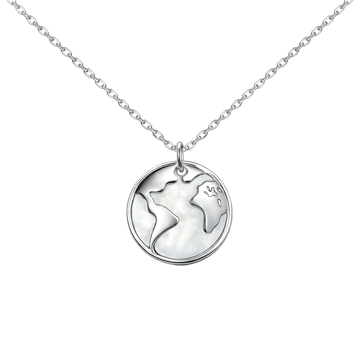 Това колие е изработено от сребро проба 925 с родиево покритие. Централният медальон представлява стилизирано изображение на планетата Земя, разположено върху основа от естествен седеф. Седефеният слой придава на бижуто нежен ирисцентен ефект, който се променя според ъгъла на светлината, напомняйки за дълбочината на океаните. Континентите са пресъздадени чрез прецизни сребърни елементи, които контрастират на сияйната повърхност. Родиевата обработка на среброто осигурява дълготрайна защита от потъмняване.