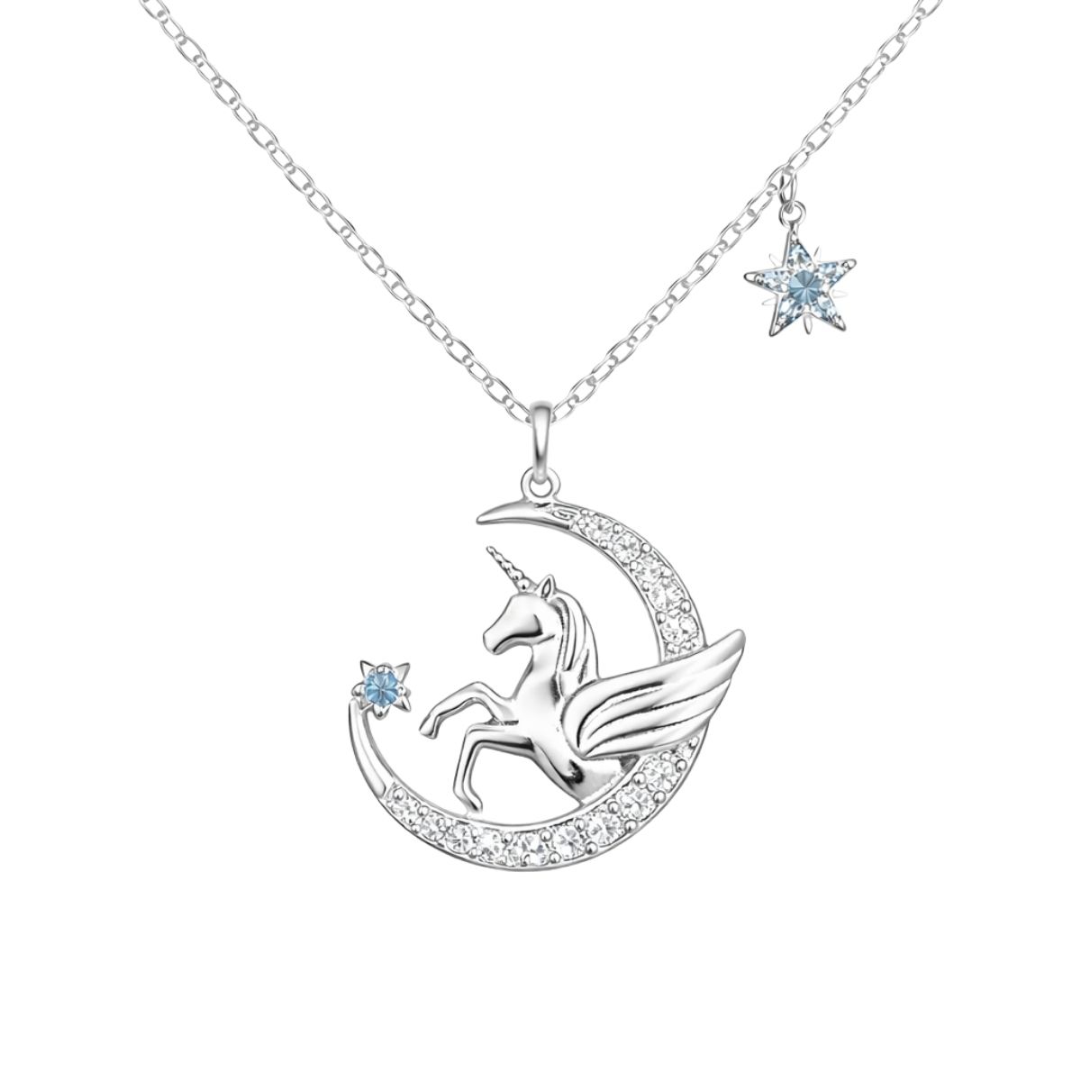Това колие е изработено от сребро проба 925 с родиево покритие. Основната висулка представлява изящен еднорог с разперени крила, разположен в прегръдката на полумесец. Луната е обсипана с блестящи бели камъни, а в единия ѝ край е акцентиран нежен син цирконий. Композицията е допълнена от малка подвижна звезда, инкрустирана със сини камъни, която добавя динамика и цвят към бижуто. Всички цирконии са с шлифовка тип брилянт. Родиевата обработка на среброто осигурява дълготрайна защита от потъмняване. Колието е снабдено с фина сребърна верижка, която подчертава ефирното излъчване на аксесоара.